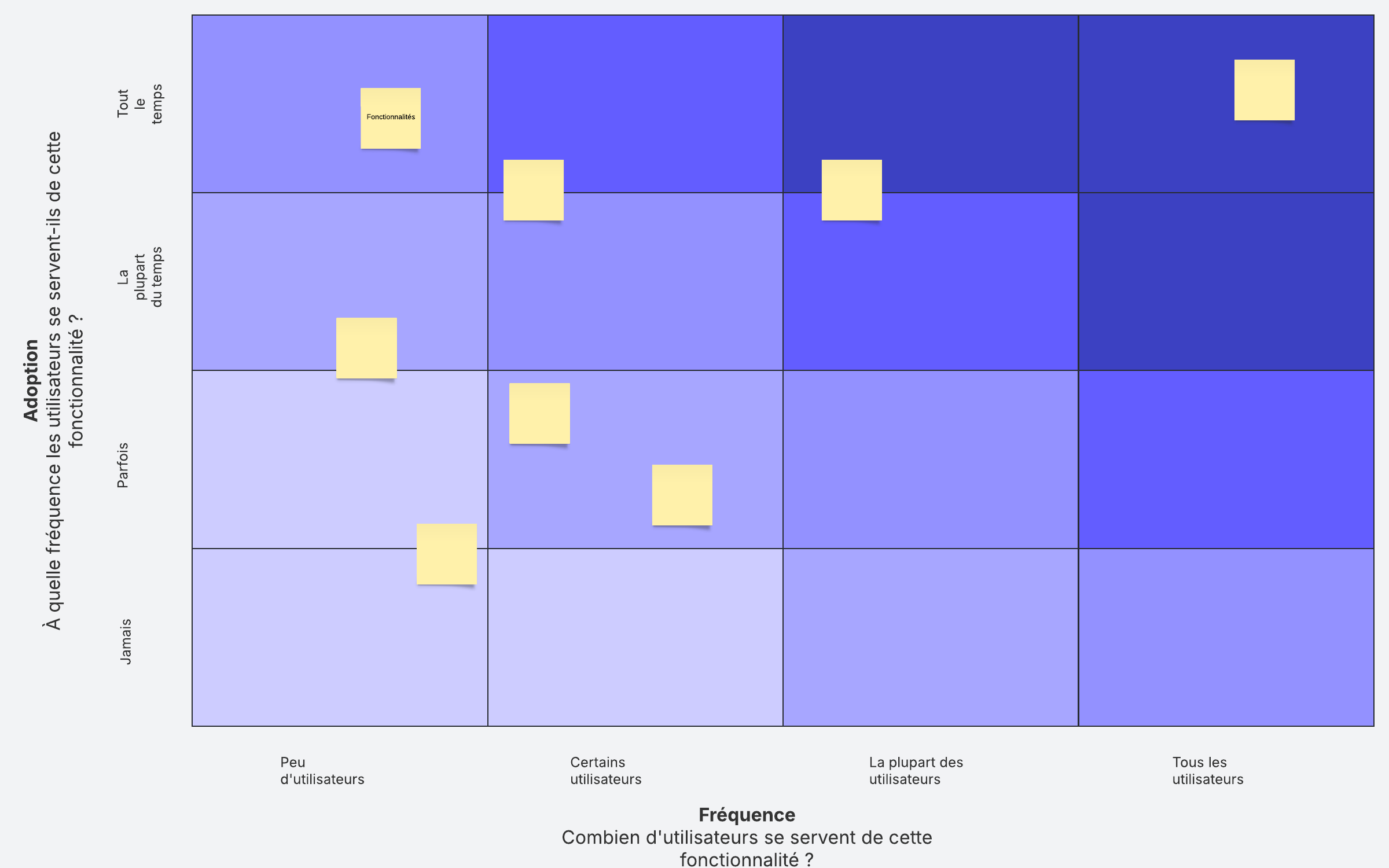 Concentrez-vous sur vos fonctionnalités populaires en réalisant une analyse des fonctionnalités. Ajoutez vos fonctionnalités à la matrice selon leur fréquence d'utilisation et leur taux d'adoption.
