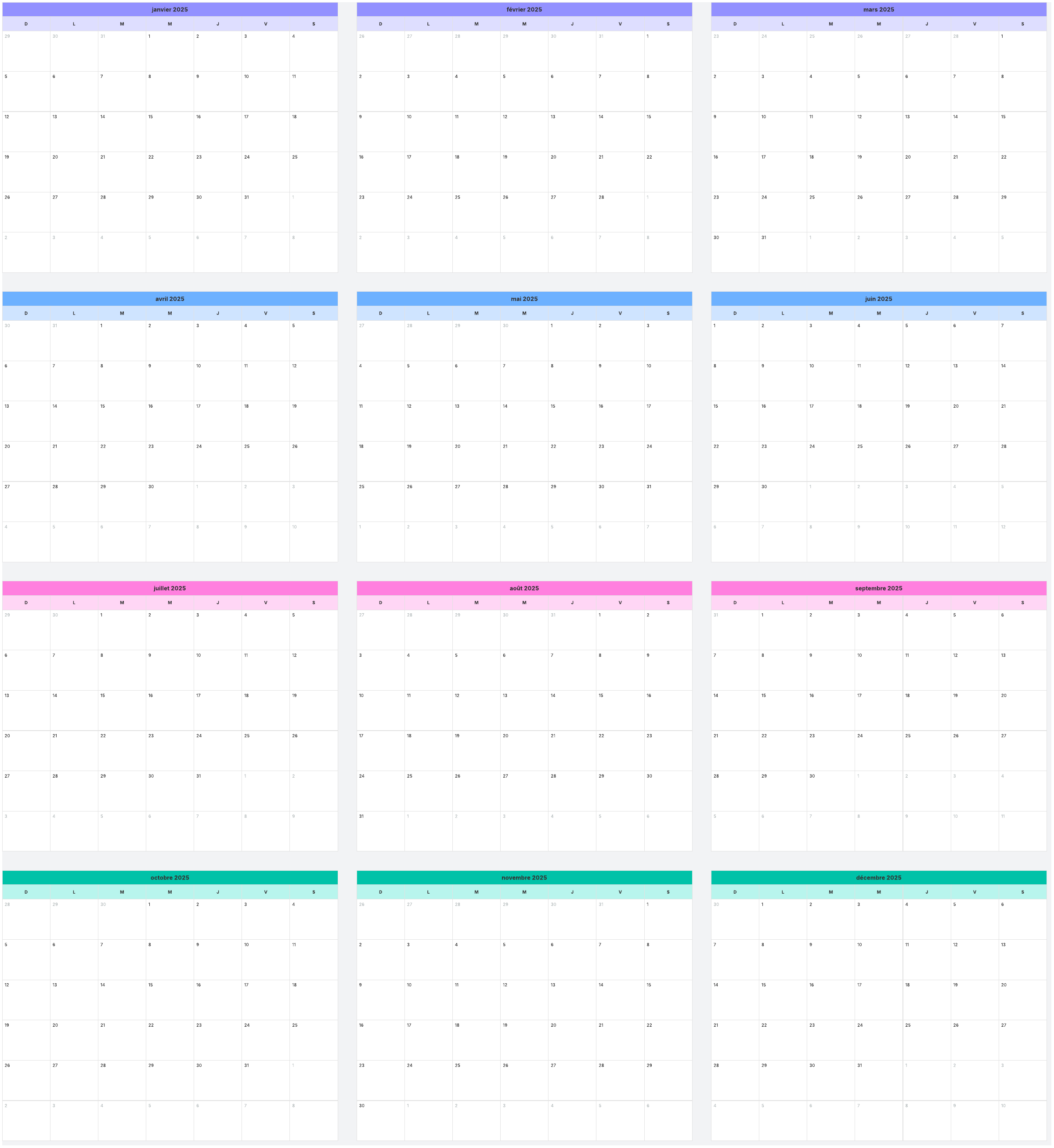 Faites de 2025 votre année la plus réussie avec ce modèle de calendrier annuel. Ajoutez vos projets, échéances et jalons importants afin de tenir vos équipes informées et coordonnées, ou utilisez ce modèle pour suivre votre liste de tâches.