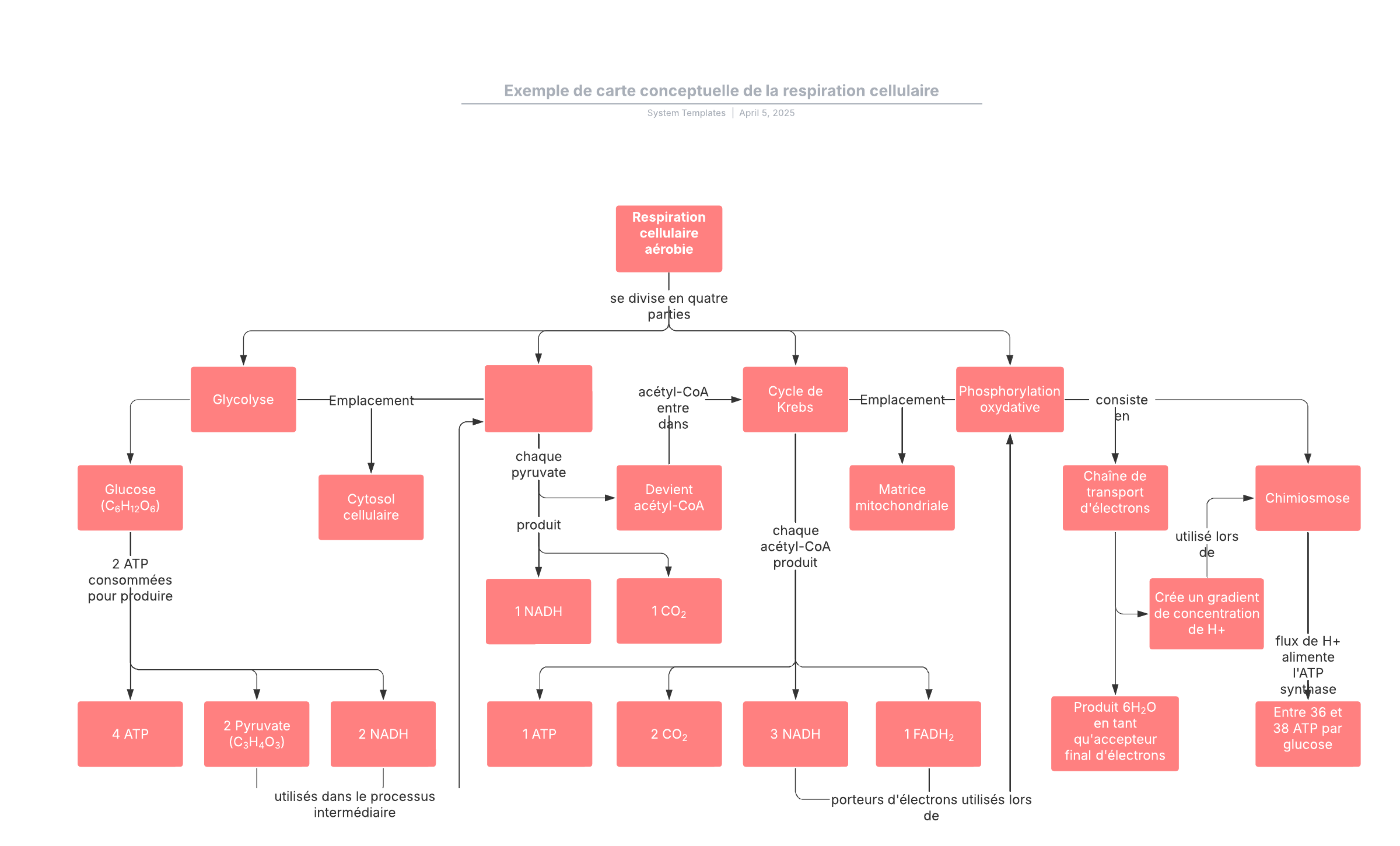 Ouvrez ce modèle pour afficher un exemple détaillé de carte conceptuelle de la respiration cellulaire que vous pouvez personnaliser selon votre cas d'utilisation.