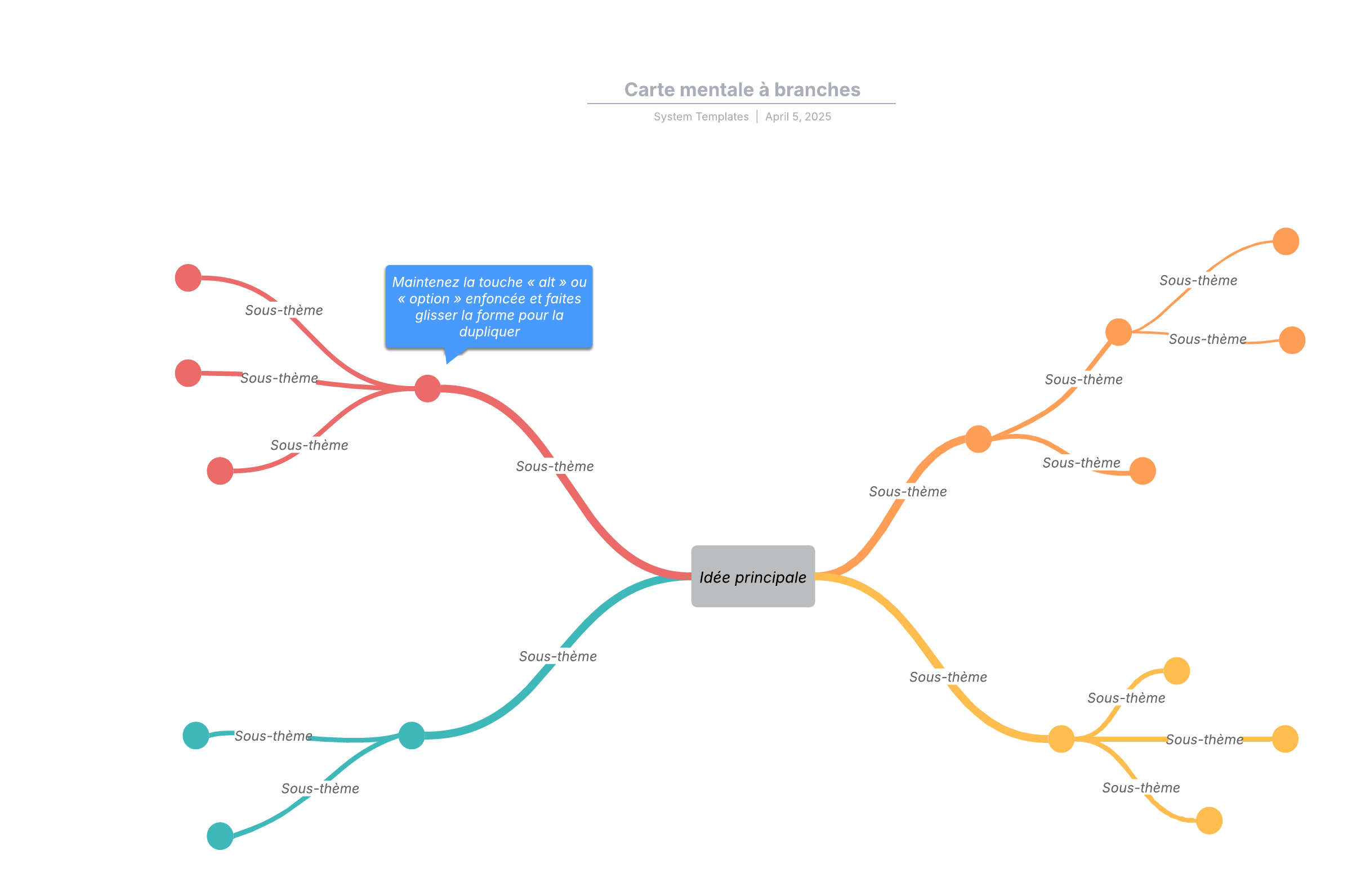 Ouvrez ce modèle de carte mentale à branches et ajoutez-y du contenu pour le personnaliser selon votre cas d'utilisation.