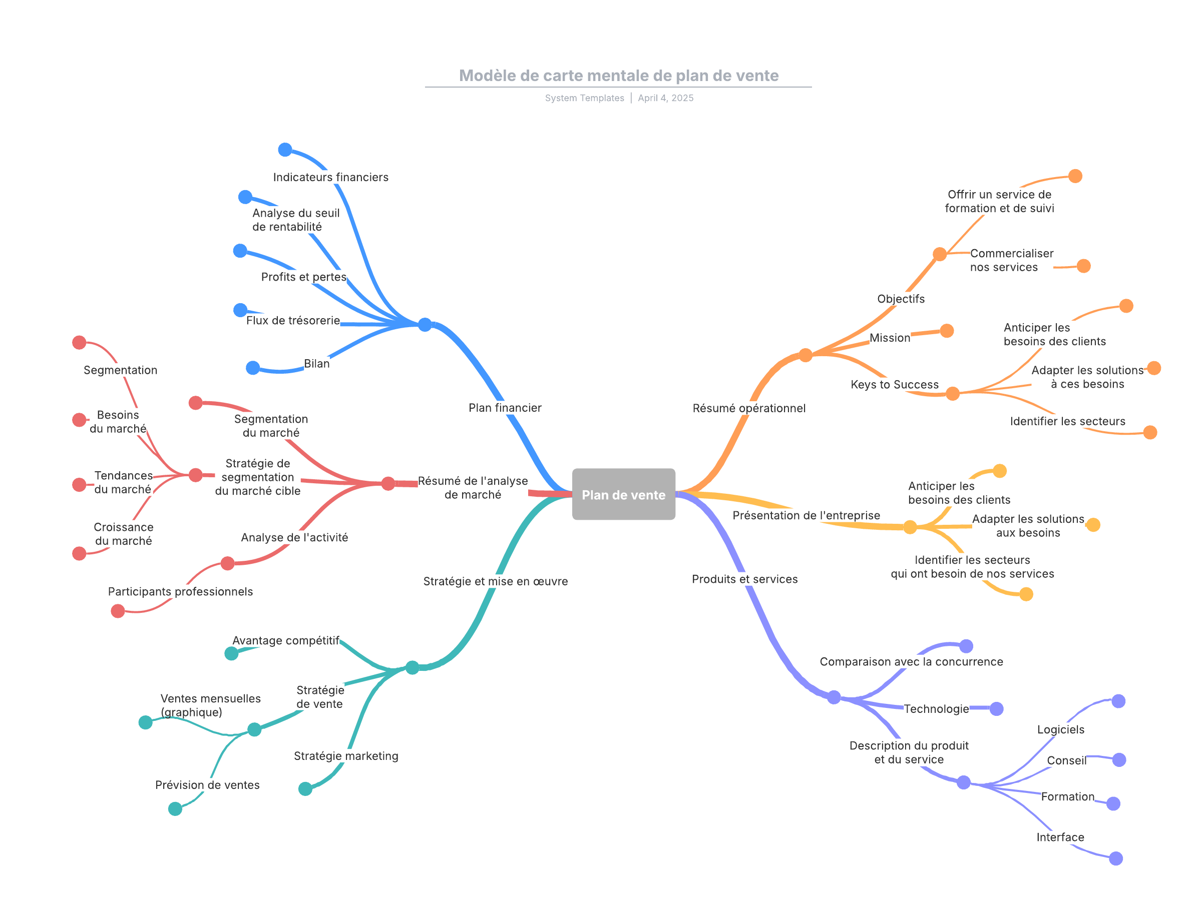 Ouvrez ce modèle pour afficher un exemple détaillé de carte mentale de plan de vente, à personnaliser selon votre cas d'utilisation.