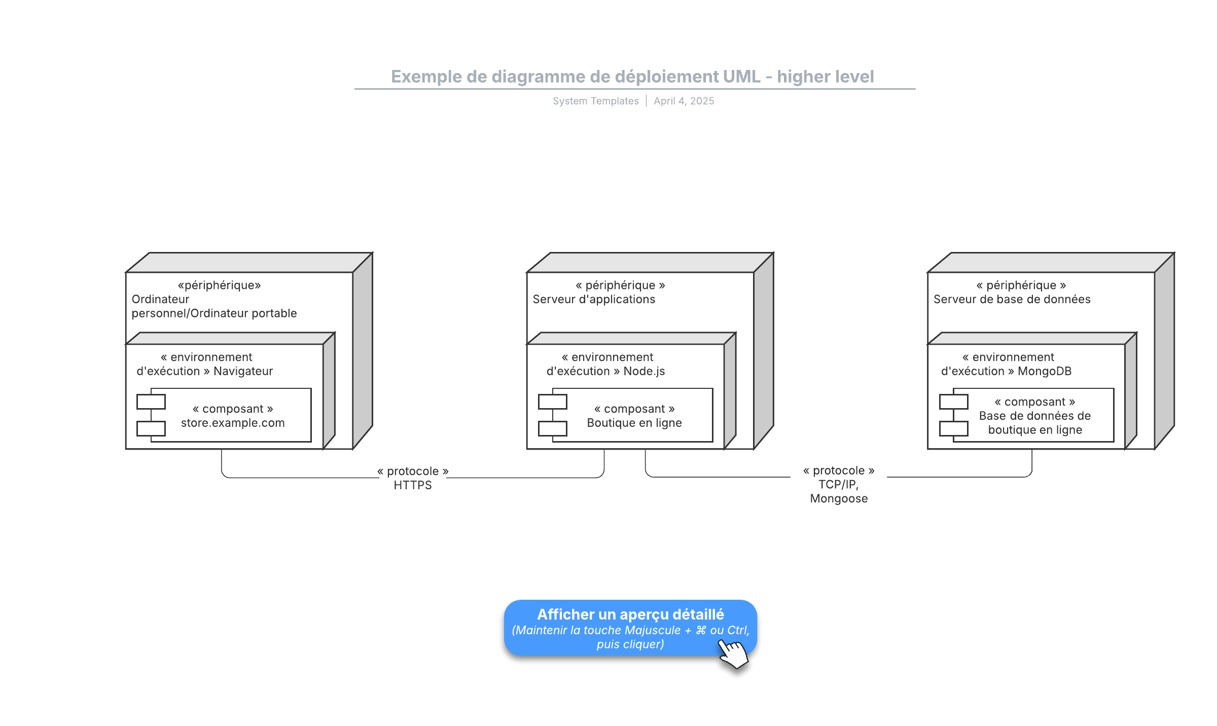 Ouvrez ce modèle pour visualiser un exemple détaillé de diagramme de déploiement UML que vous pouvez personnaliser selon votre cas d'utilisation.