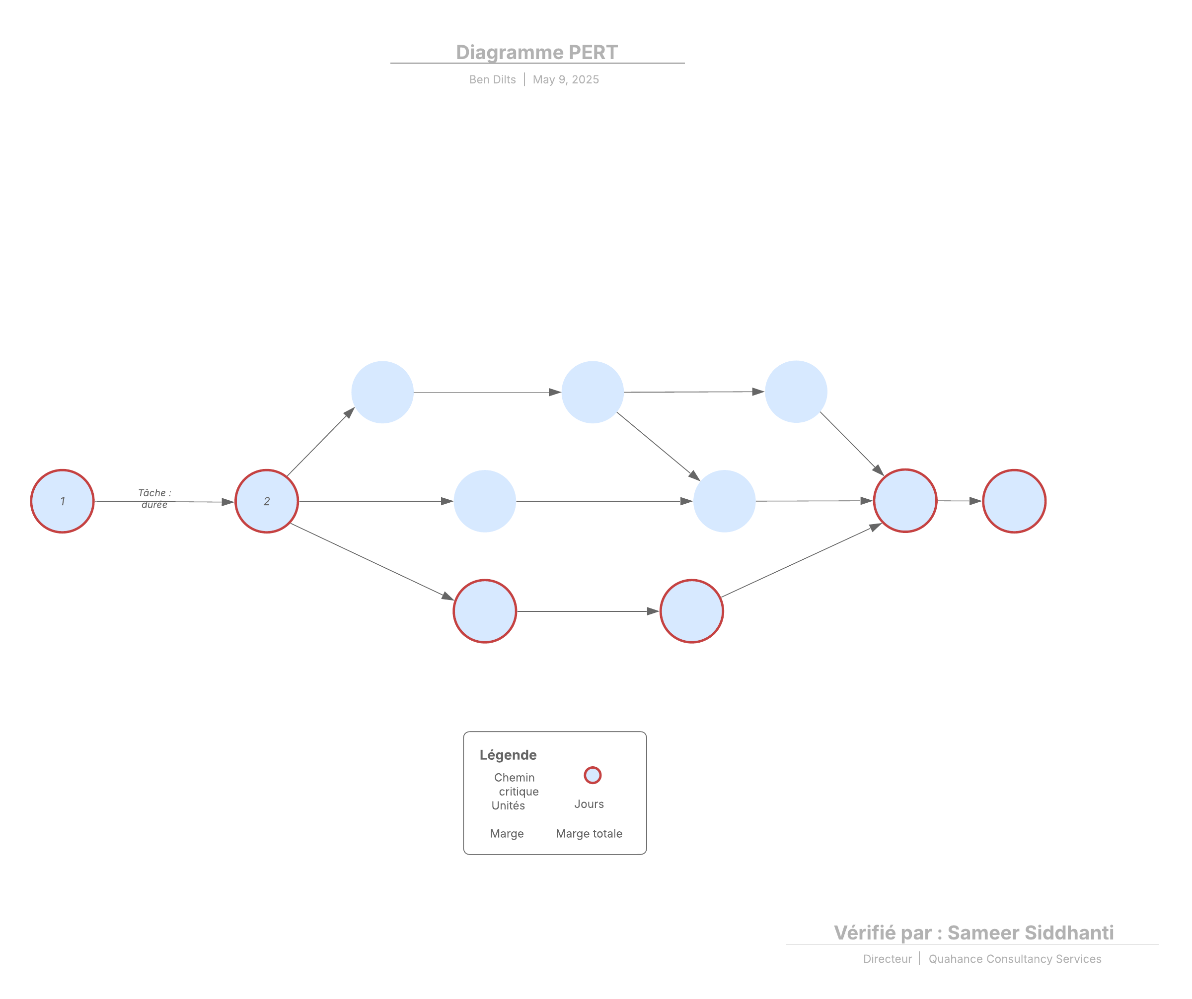 Les diagrammes PERT sont une représentation graphique des tâches et du calendrier d'un projet. Ils permettent d'organiser diverses parties d'un processus et de schématiser les interdépendances.