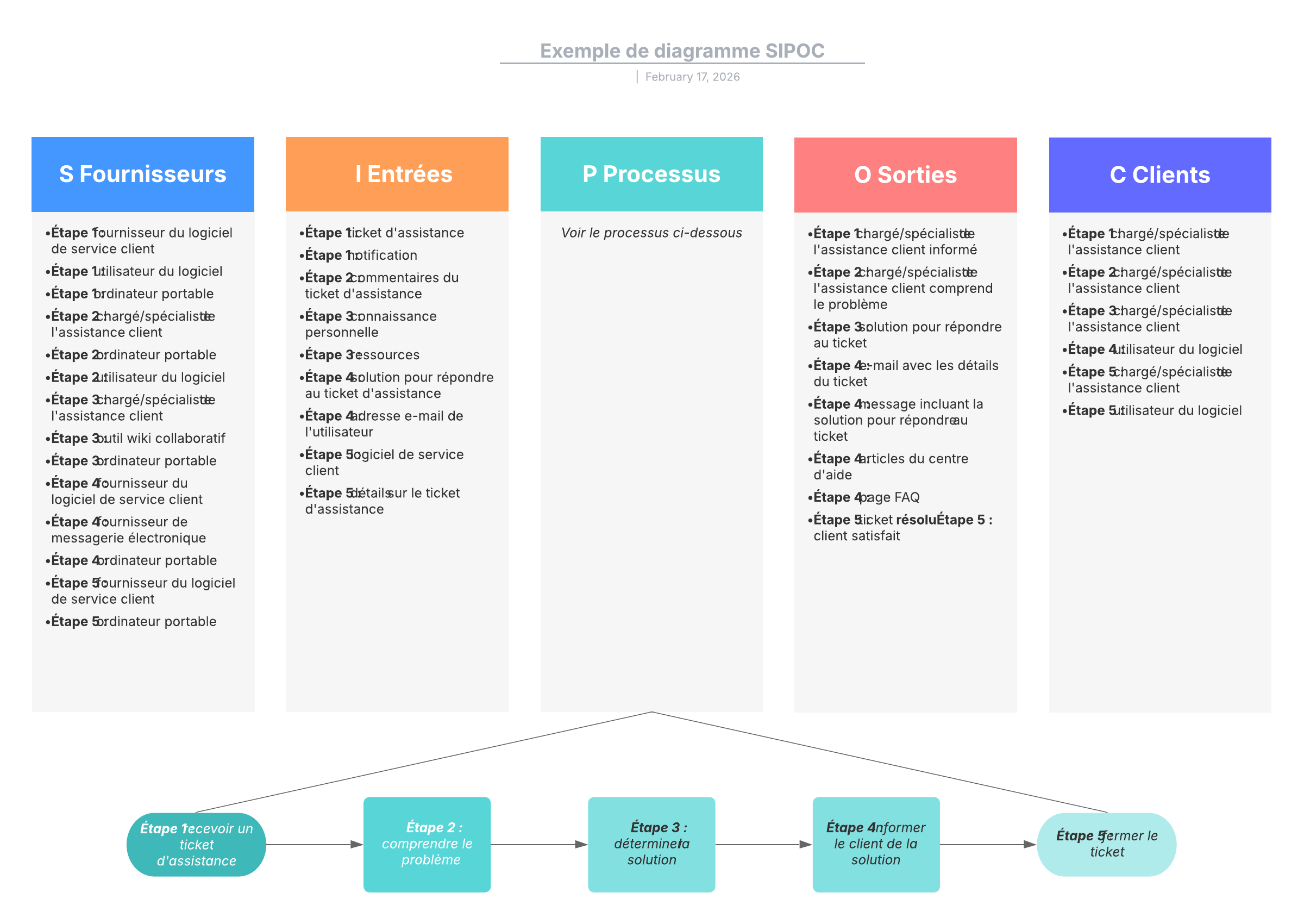 Cet exemple de diagramme SIPOC basique (fournisseurs, entrées, processus, sorties, clients) peut vous aider à :