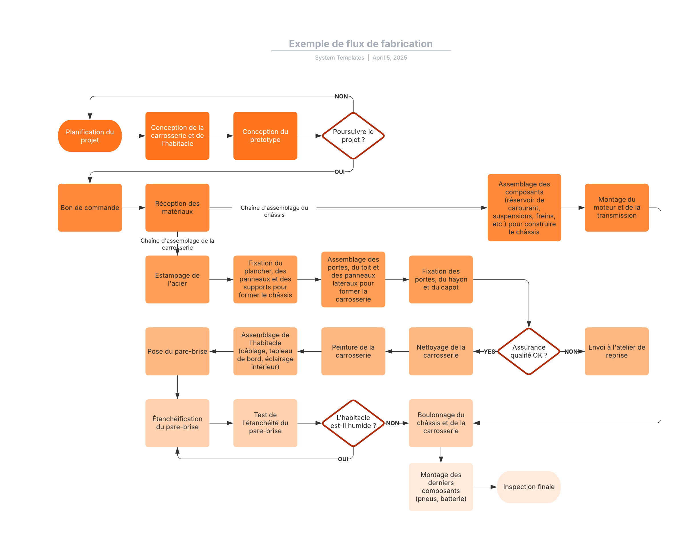 Ouvrez ce modèle pour visualiser un exemple détaillé de diagramme de flux de fabrication que vous pouvez personnaliser en fonction de votre cas d'utilisation.