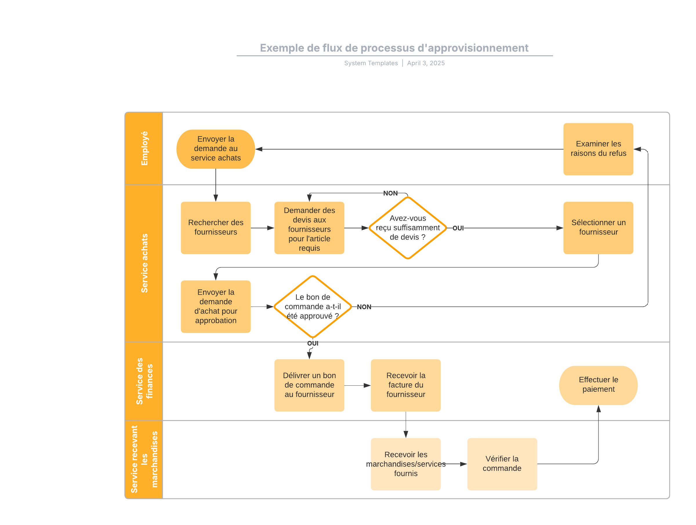 Ouvrez ce modèle pour voir un exemple détaillé d'un flux de processus d'approvisionnement que vous pouvez adapter à votre cas d'utilisation.