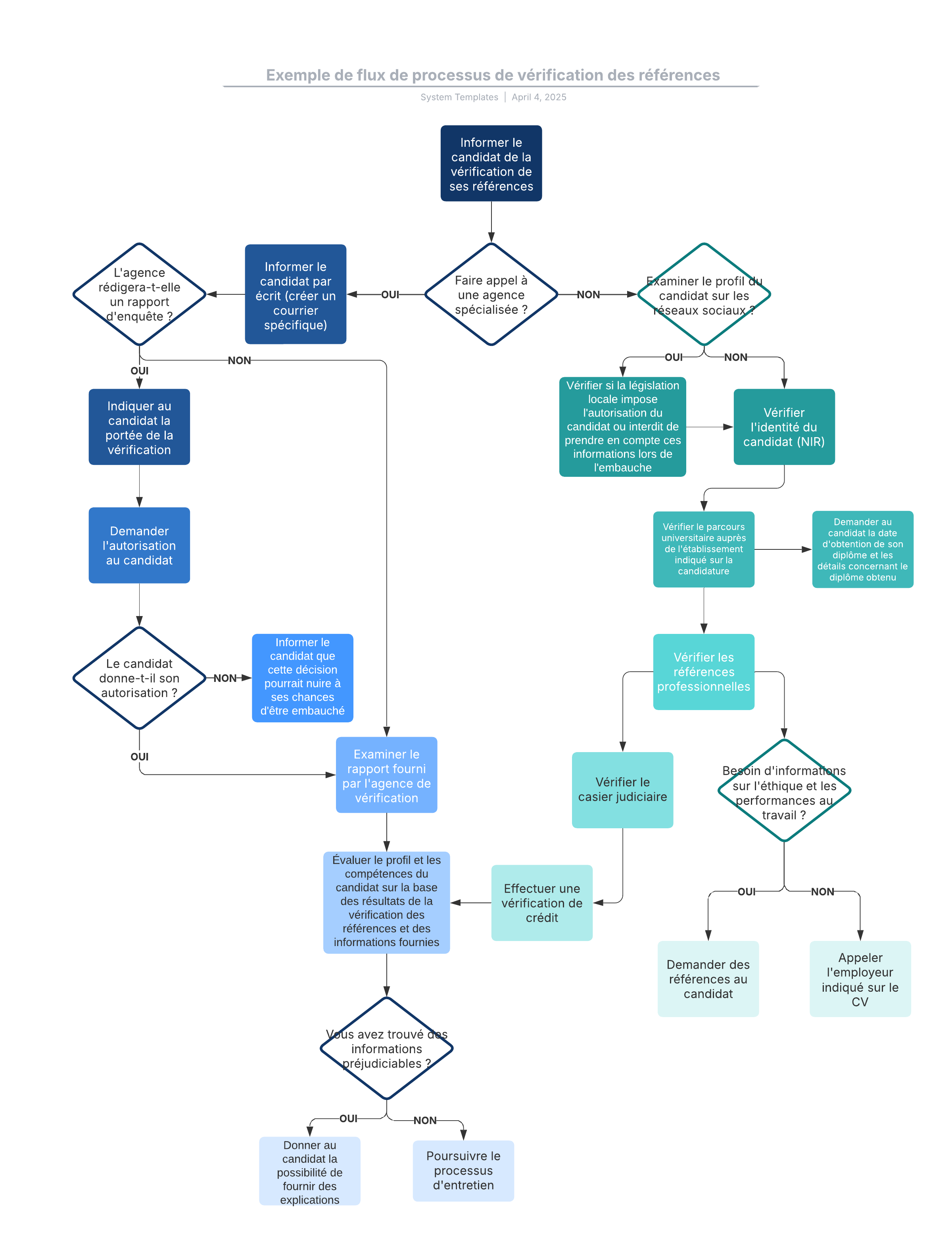 Ouvrez ce modèle pour afficher un exemple détaillé de flux de processus de vérification des références, à personnaliser selon votre cas d'utilisation.