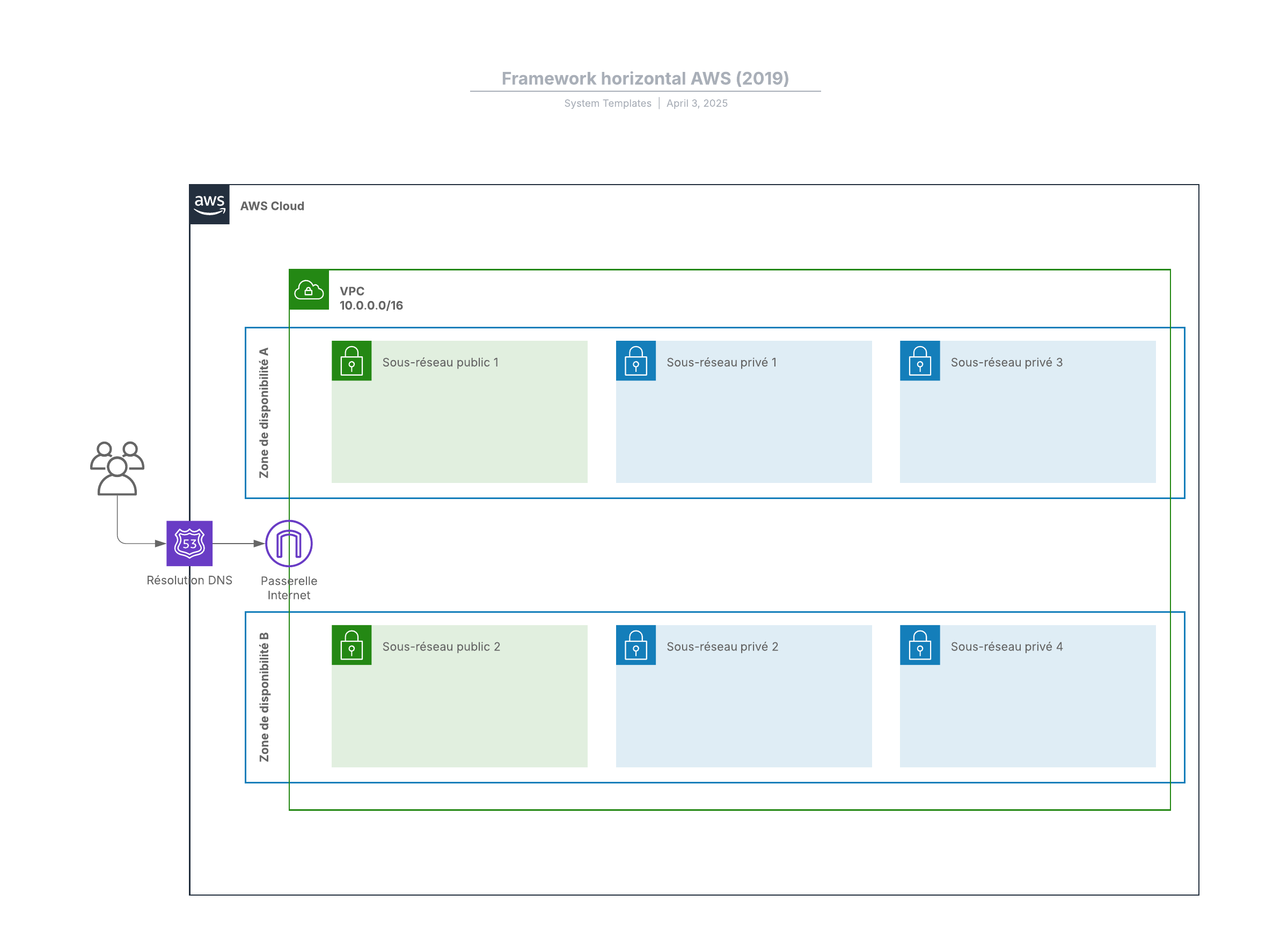 Ouvrez ce modèle pour consulter un point de départ standard pour votre architecture AWS, à personnaliser selon votre cas d'utilisation.
