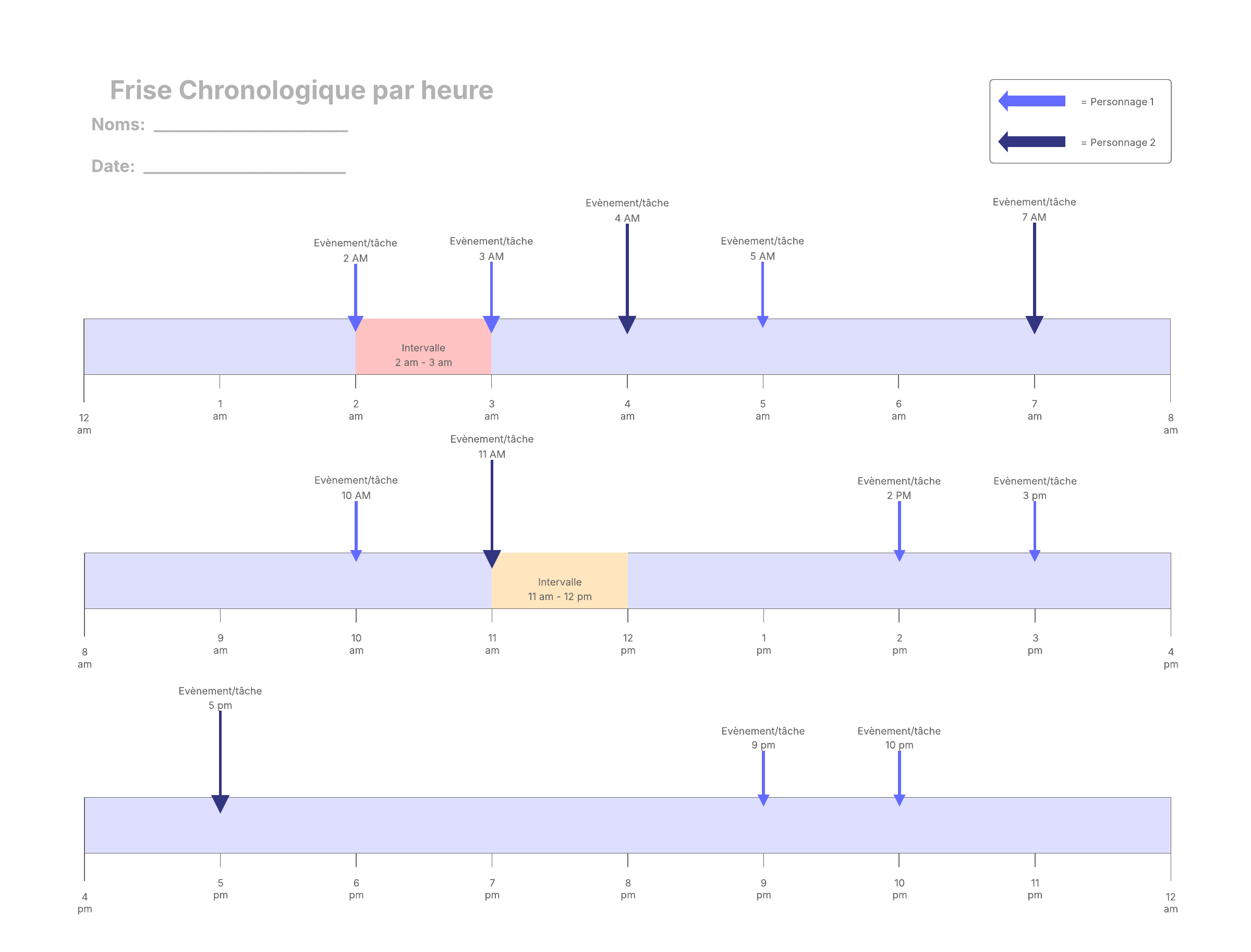 Ce modèle de frise chronologique vous permet de planifier méticuleusement des événements dans un temps très court. Pour personnaliser ce modèle, ajouter des créneaux horaires et des formes grâce à la bibliothèque des formes.