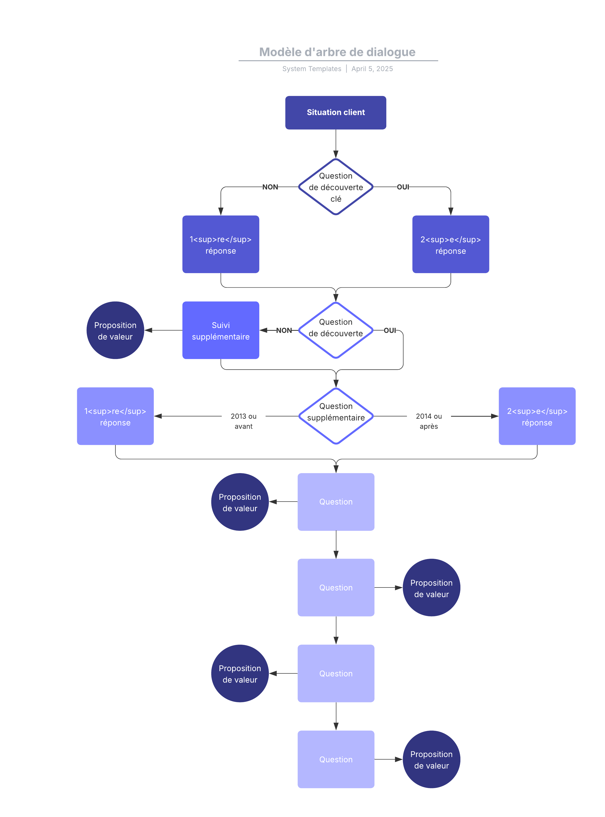 Ouvrez ce modèle pour afficher un exemple détaillé d'arbre de dialogue, à personnaliser selon votre cas d'utilisation.