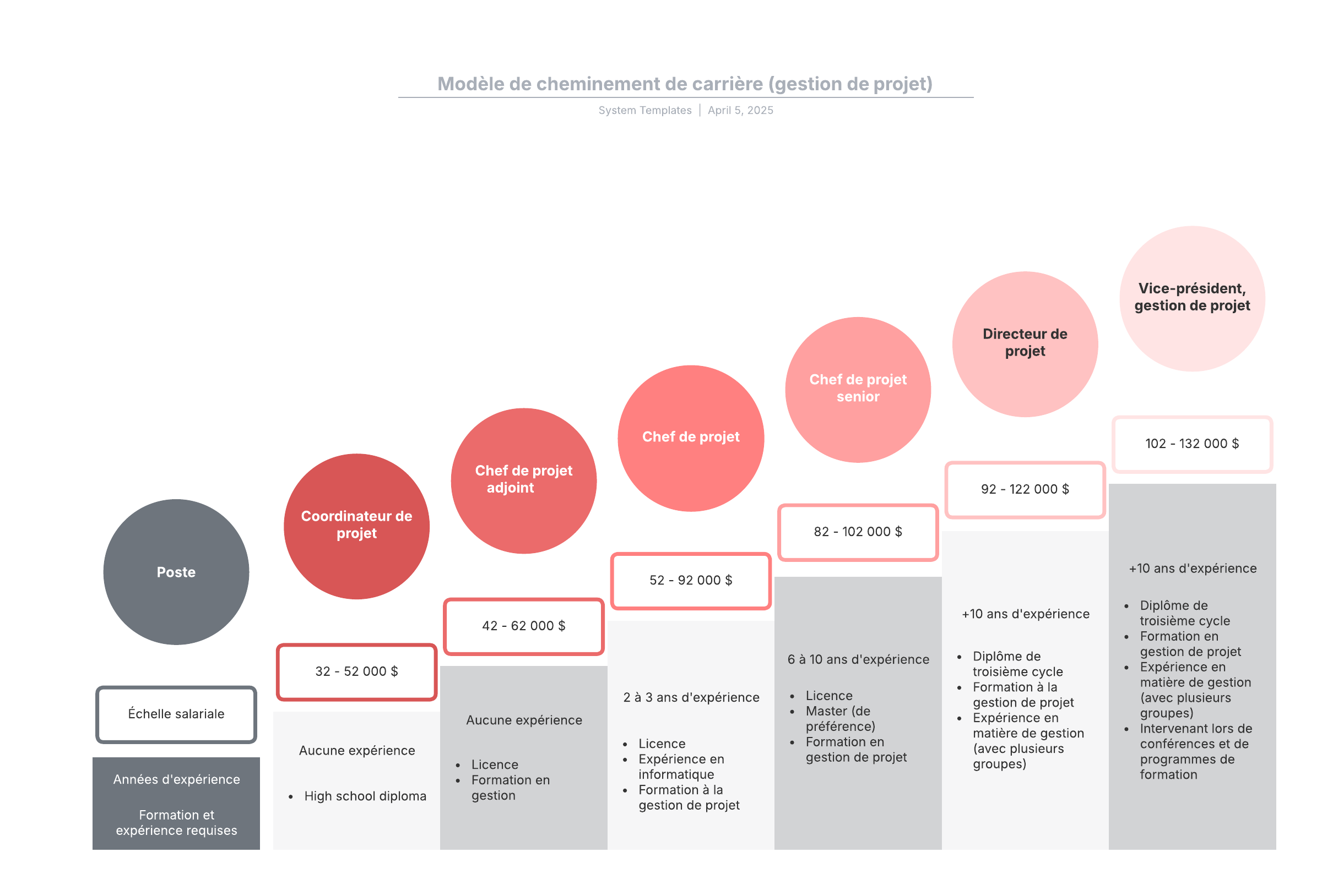 Ouvrez ce modèle pour afficher un exemple détaillé de cheminement de carrière en gestion de projet que vous pouvez personnaliser selon votre cas d'utilisation.