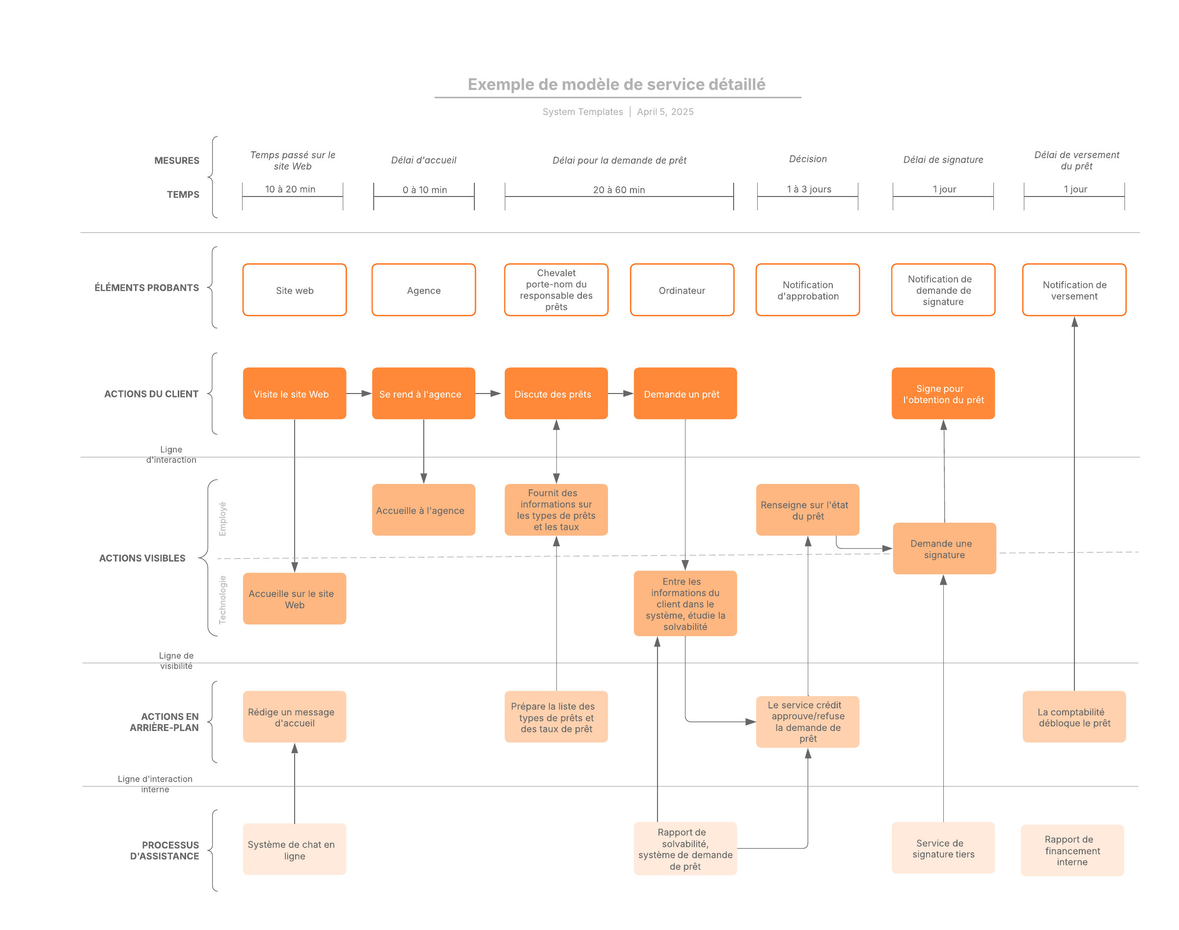 Ce diagramme de modèle de service représente les connexions entre les services et les processus auxquels les clients sont confrontés lorsqu'ils demandent un prêt. La modélisation du service est bénéfique, car elle peut aider à identifier les inefficacités et les points faibles du processus en cours. Elle a également son utilité lorsqu'il s'agit de schématiser des processus sous leur forme idéale (améliorée) afin d'optimiser l'expérience d'un client.