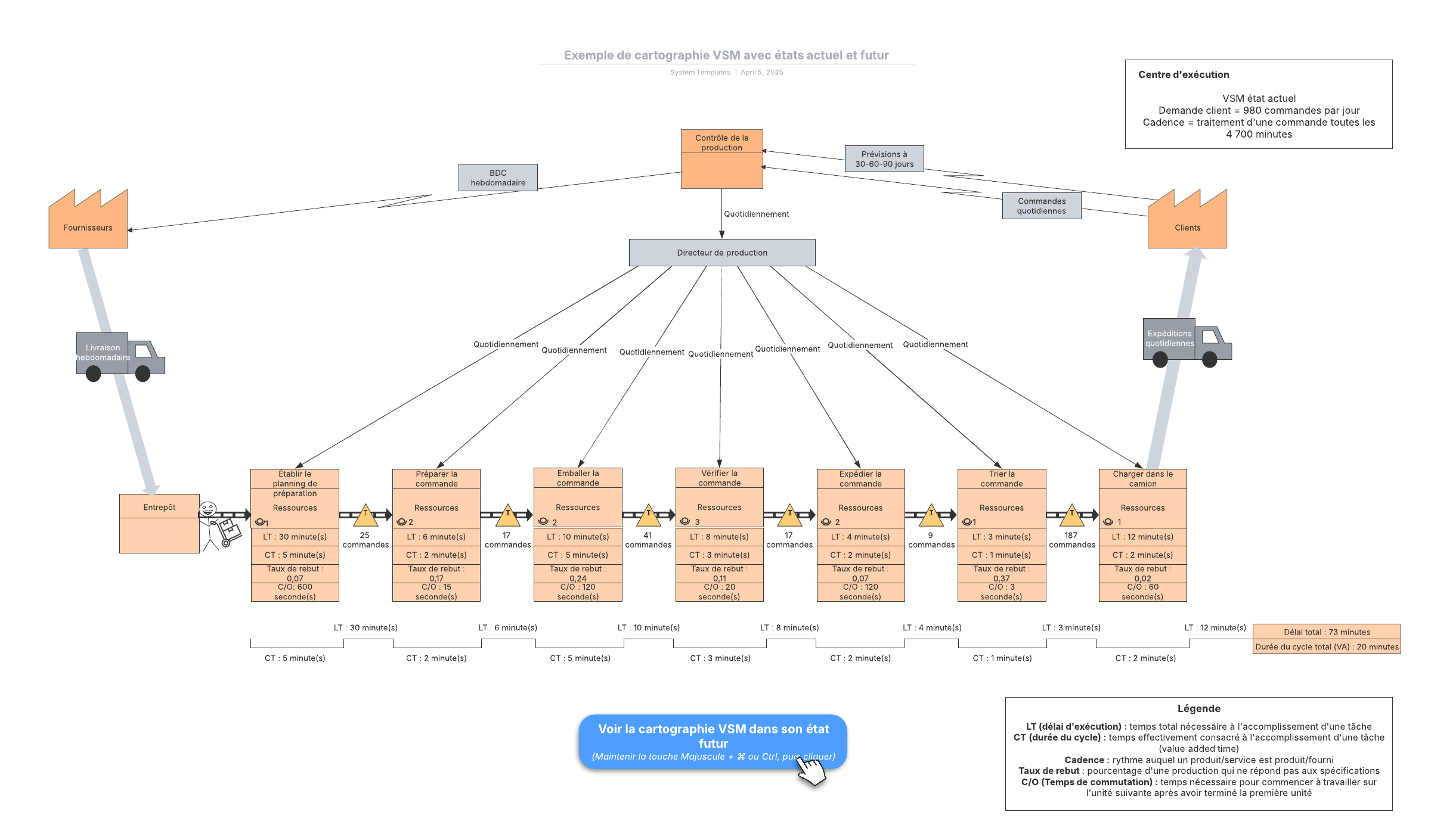 Ouvrez ce modèle pour afficher un exemple détaillé de cartographie VSM orientée produit, à personnaliser selon votre cas d'utilisation.