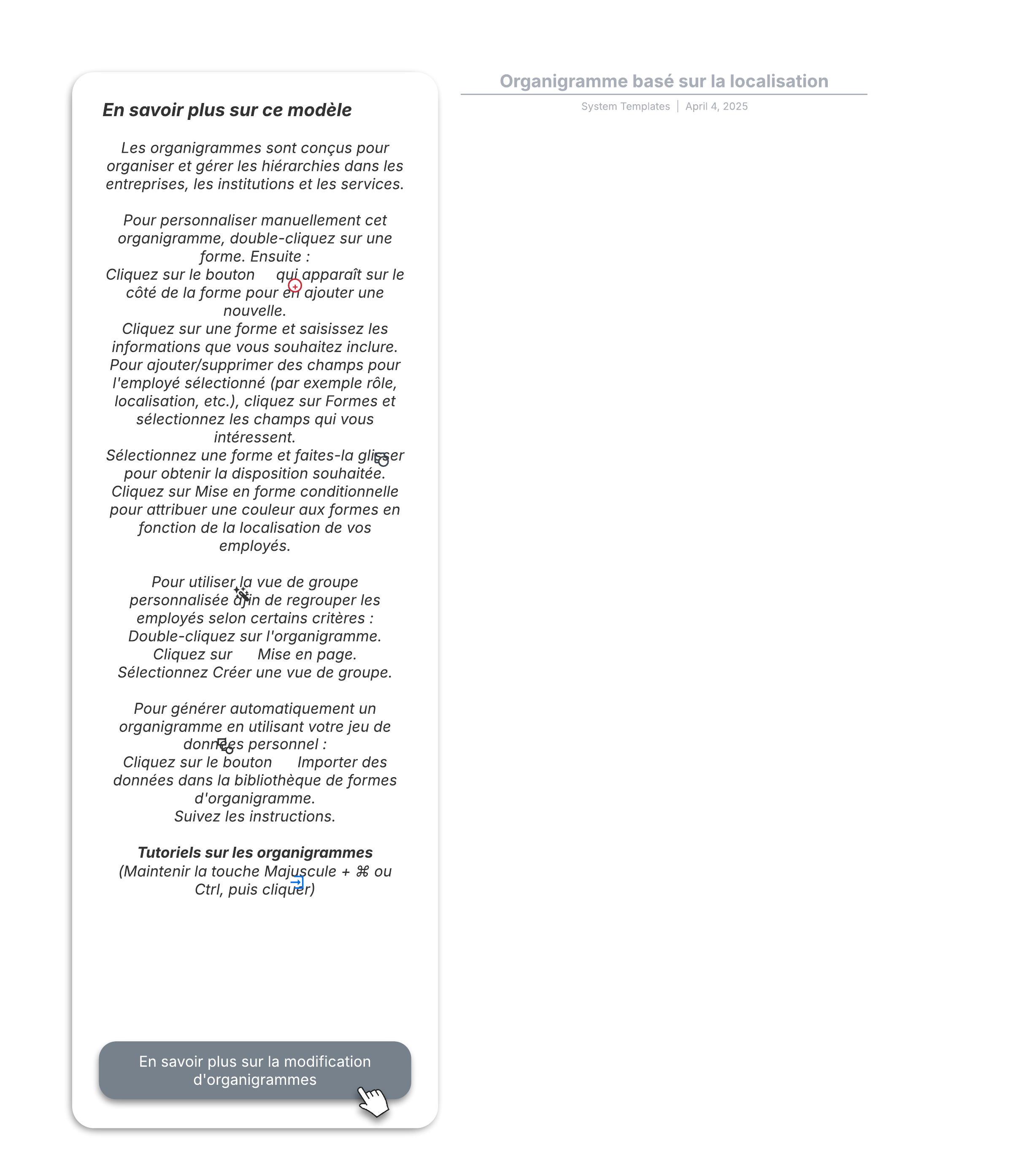 Ouvrez ce modèle d'organigramme basé sur la localisation et ajoutez-y du contenu pour le personnaliser selon votre cas d'utilisation.