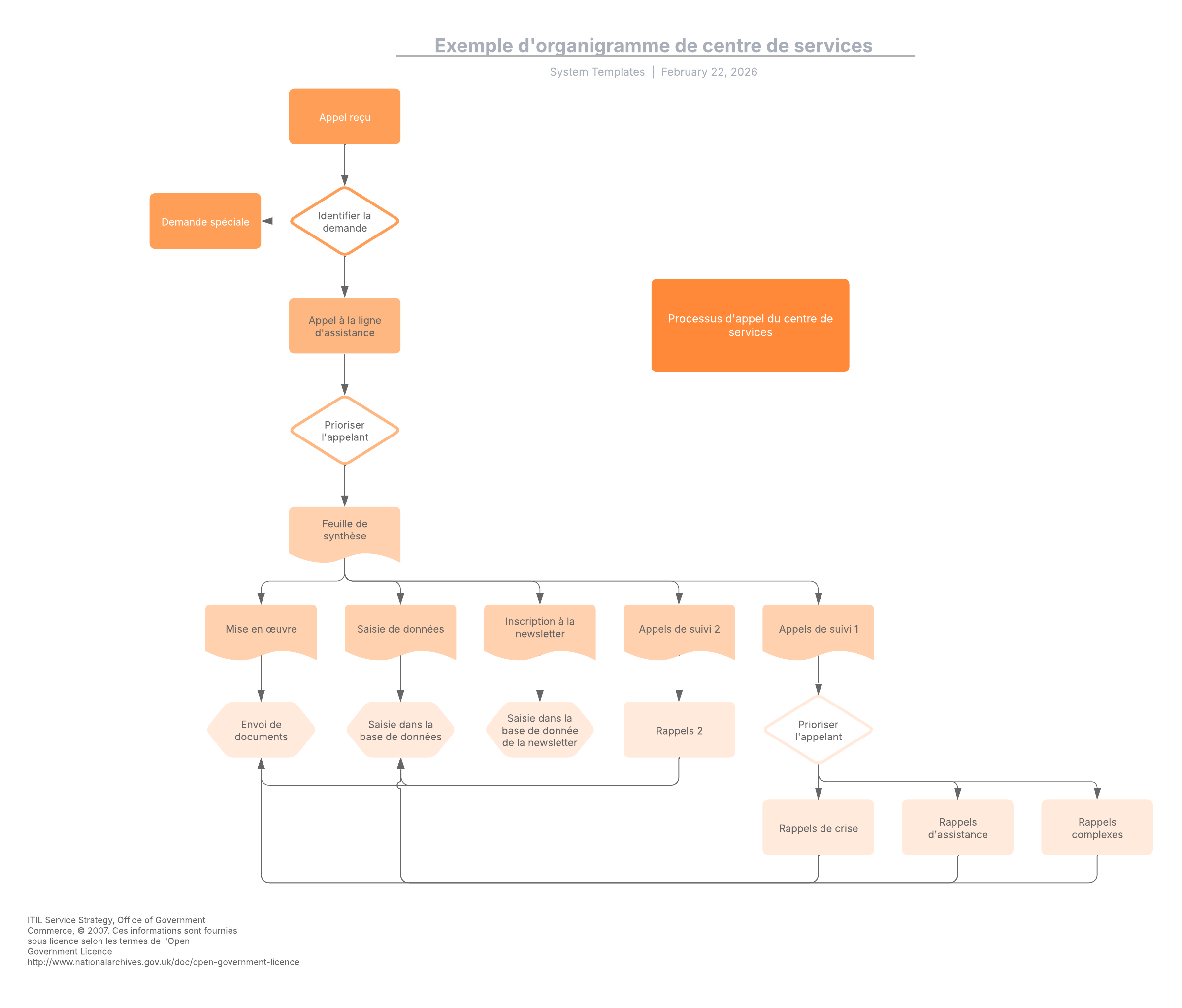 Ouvrez ce modèle pour afficher un exemple détaillé d'organigramme de centre de services, à personnaliser selon votre cas d'utilisation.