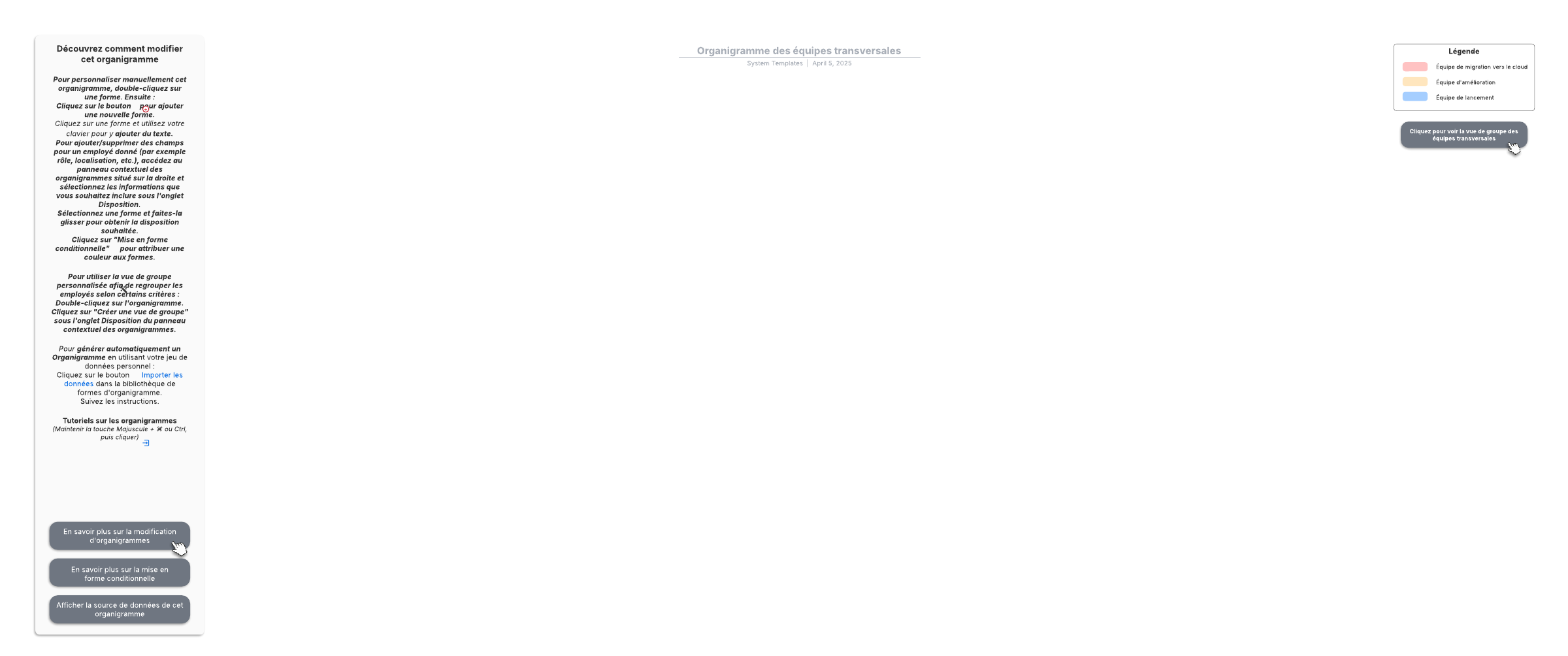 Ouvrez ce modèle pour afficher un exemple détaillé d'organigramme des équipes transversales, à personnaliser selon votre cas d'utilisation.