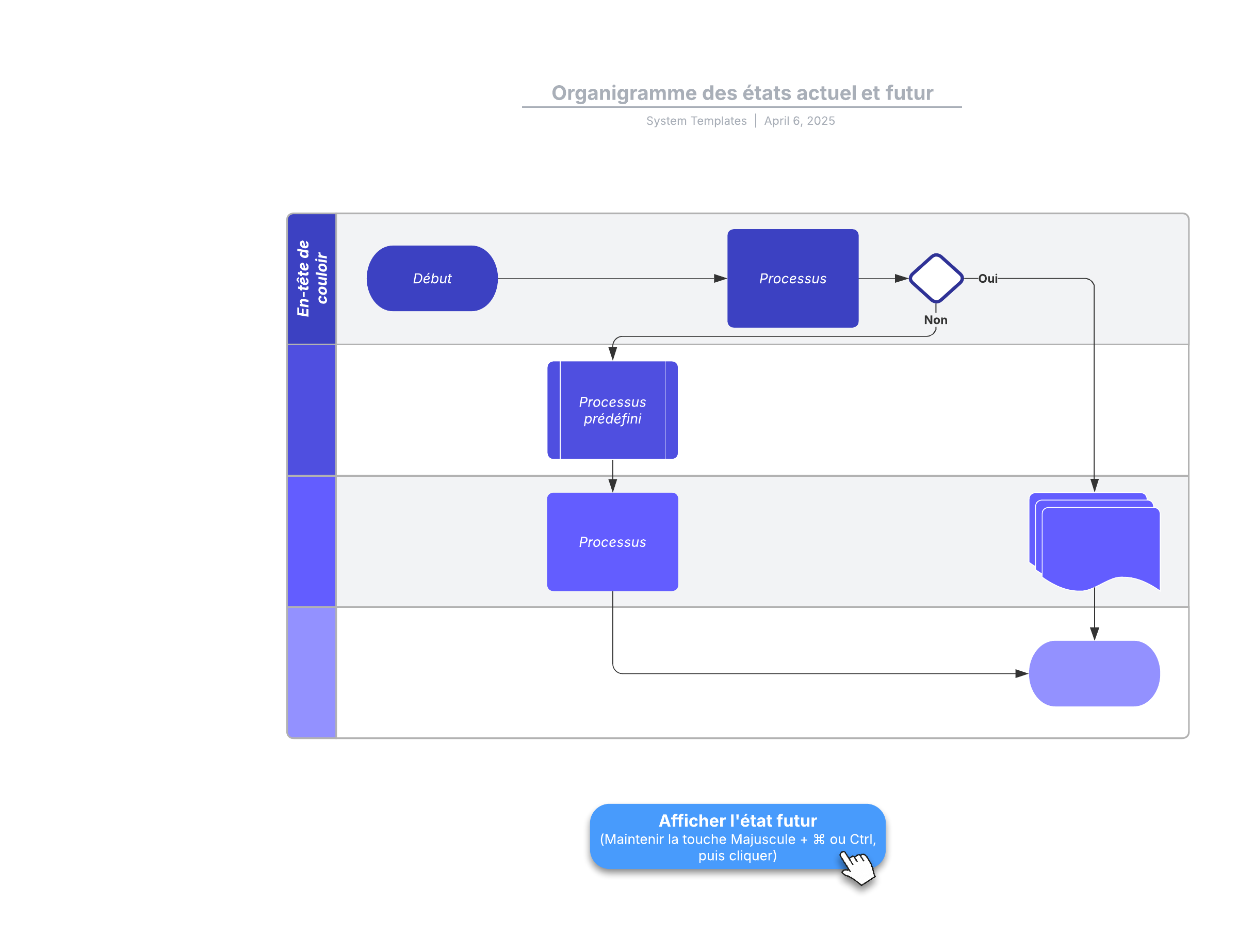 Ouvrez ce modèle d'organigramme des états actuel et futur, et ajoutez-y du contenu pour le personnaliser selon votre cas d'utilisation.