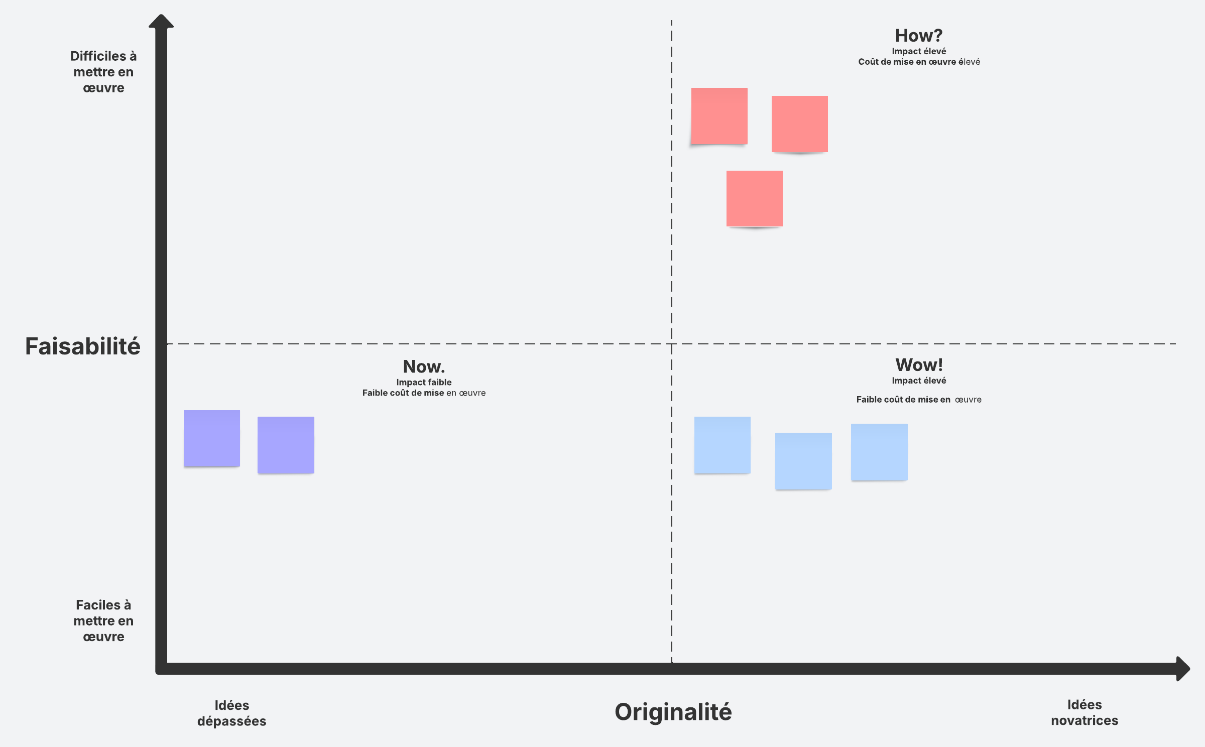 Utilisez cette matrice How, Now, Wow pour évaluer des idées en fonction de leur faisabilité et de leur originalité. Placez vos idées sur la matrice pour identifier celles qui sont à la fois innovantes et susceptibles d'être mises en œuvre rapidement.