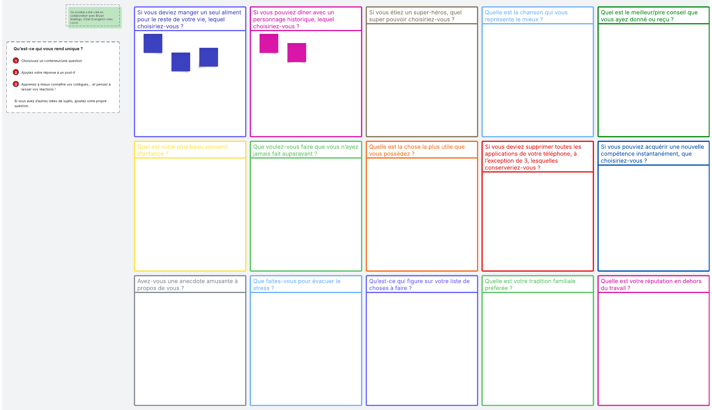 Commencez par ouvrir le modèle et partagez le tableau Lucidspark avec vos collaborateurs. Il vous suffit ensuite de choisir un conteneur avec une question et d’ajouter votre réponse à l’aide d’un post-it.