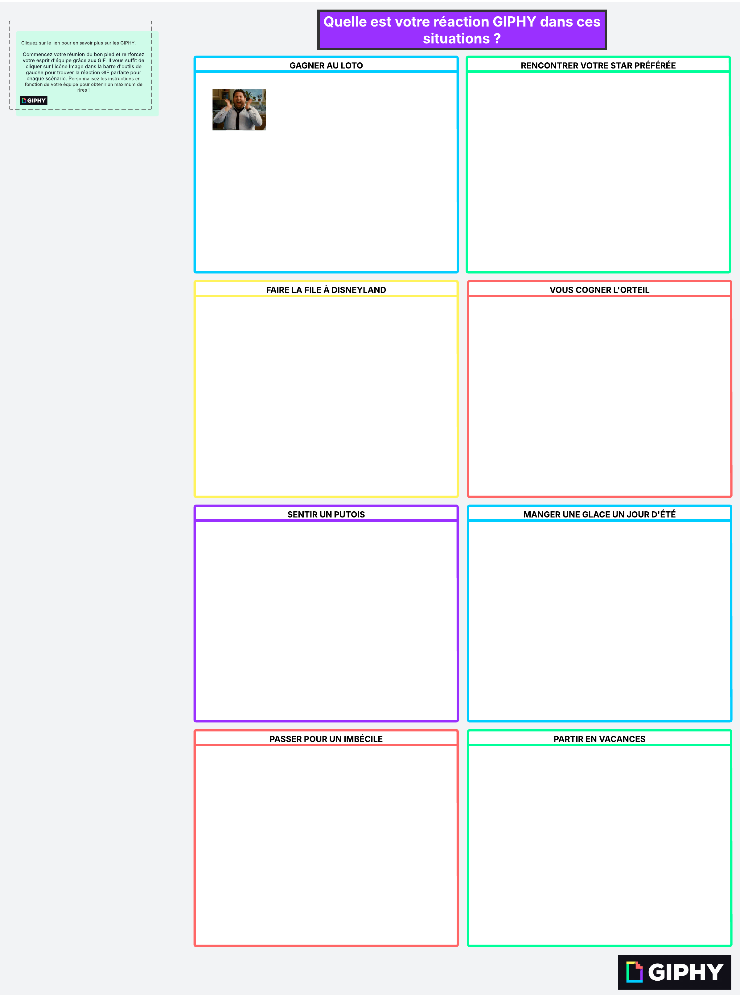 Commencez votre réunion du bon pied et renforcez votre esprit d'équipe grâce aux GIF. Il vous suffit de cliquer sur l'icône Image dans la barre d'outils de gauche pour trouver la réaction GIF parfaite pour chaque scénario. Personnalisez les instructions en fonction de votre équipe pour obtenir un maximum de rires !