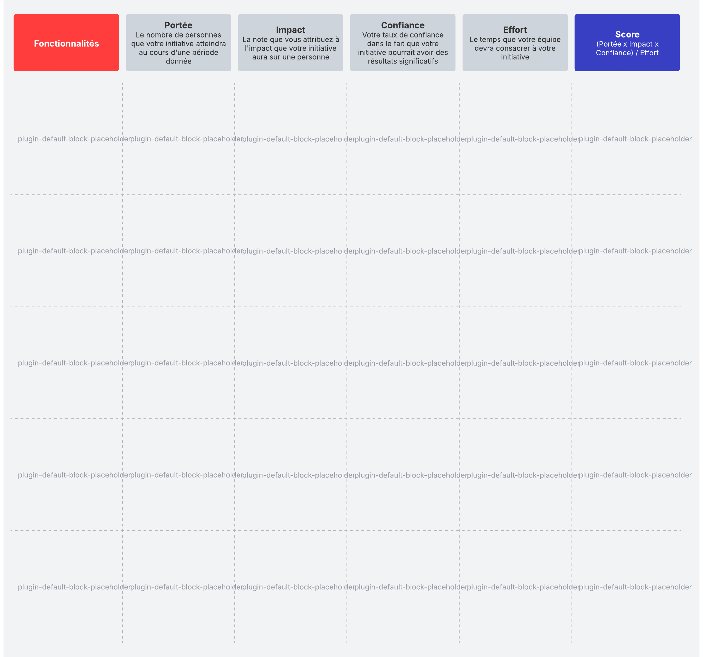 Classez par ordre de priorité les produits ou les fonctionnalités à ajouter à votre roadmap en leur attribuant un score en fonction de quatre facteurs : la portée, l'impact, la confiance et l'effort.