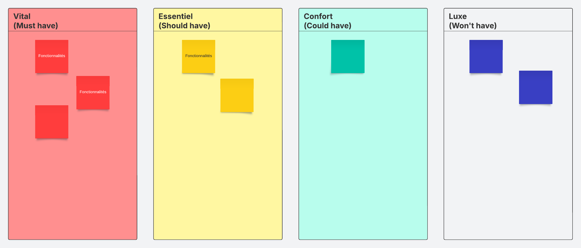 Essayez la méthode MoSCoW pour hiérarchiser stratégiquement les initiatives et les fonctionnalités. Classez vos initiatives dans l'une des quatre catégories suivantes•: Must have (Vital), Should have (Essentiel), Could have (Confort) ou Won't have (Luxe). Une fois que vous avez déterminé quelles sont les fonctionnalités les plus utiles, vous pouvez établir des priorités de mise en œuvre. MoSCoW est un acronyme anglais dont les initiales signifient Must have, Should have, Could have et Won't have.