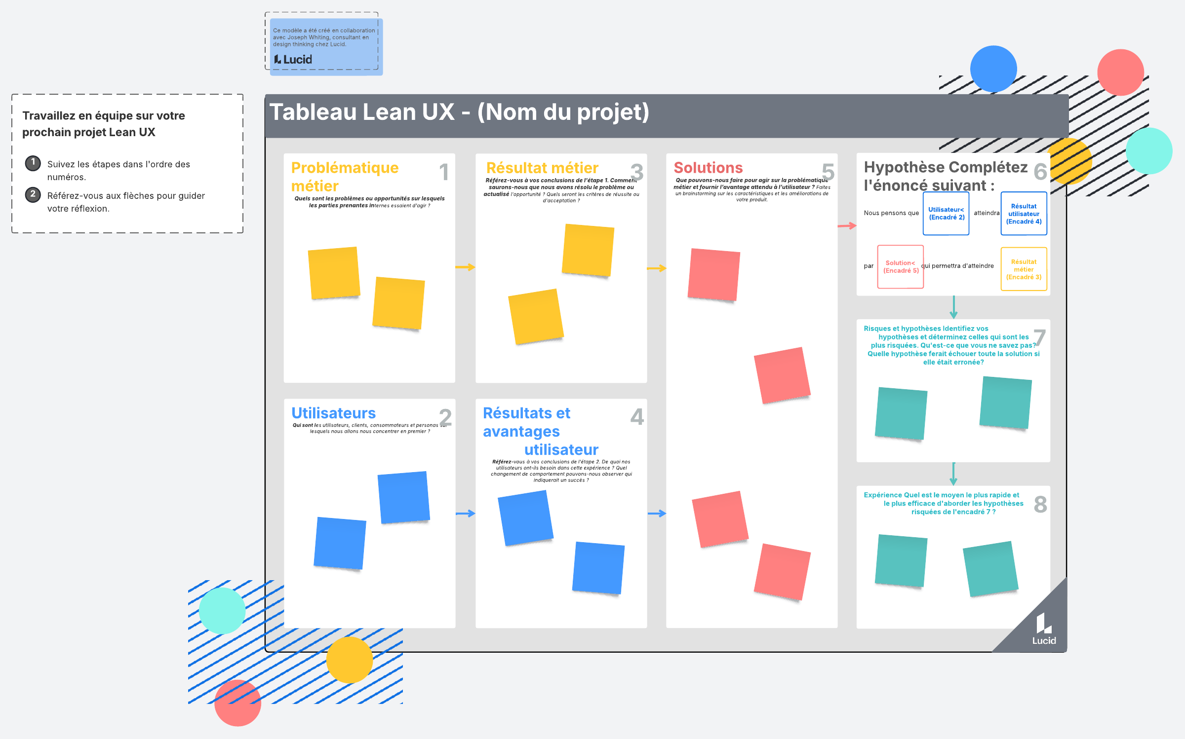 Collaborez et définissez le périmètre d'un projet Lean UX. Suivez les étapes numérotées et utilisez les flèches pour transférer les post-its d'une zone à l'autre du processus.