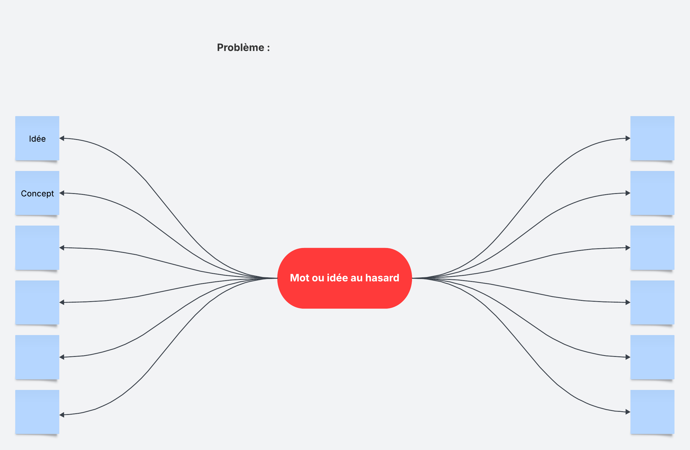 Les bonnes idées peuvent émaner de toutes les directions, et ce modèle exploite cette réalité. Commencez par un mot choisi au hasard, puis appliquez cette notion (ou les principes qui y sont liés) au problème à résoudre. Aborder une situation sous un angle différent permettra à votre équipe de rompre avec la routine et de trouver des idées et des solutions novatrices.