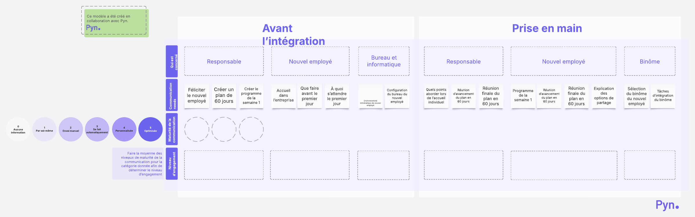 Analysez le parcours de chaque employé, avant et pendant son intégration, avec ce modèle de parcours d’employé créé par Pyn.