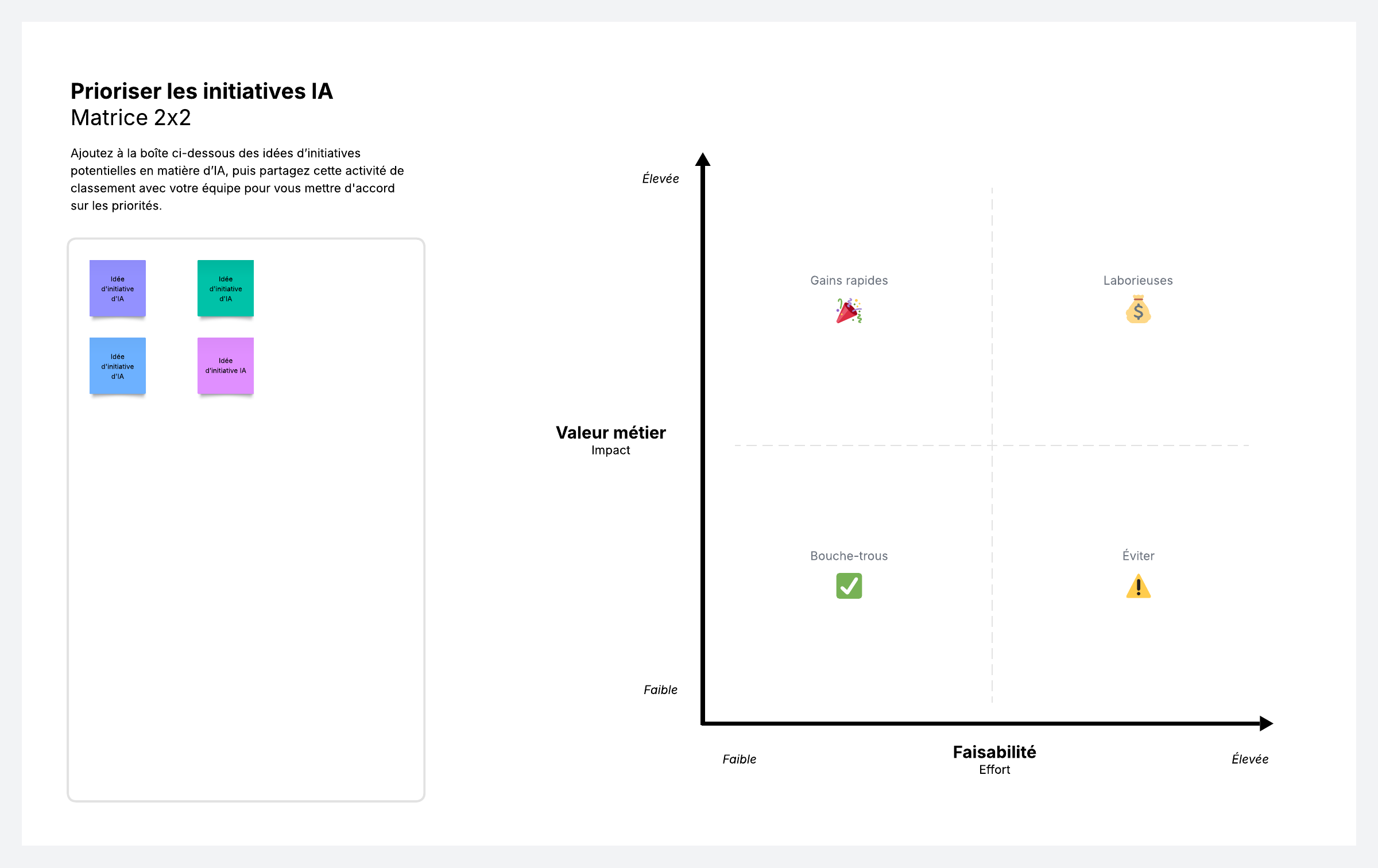 Classez les idées d’initiatives IA sur une matrice 2x2 comparant la valeur métier et la faisabilité.