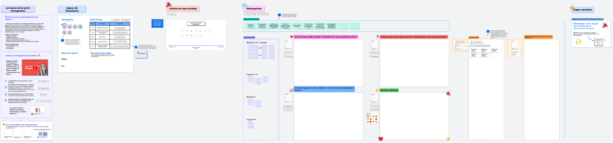 Utilisez ce modèle de rétrospective une fois votre sprint d'équipe terminé. Invitez les membres de votre équipe à réfléchir et à laisser des commentaires pour contribuer à l'amélioration des processus et des prochains sprints.
