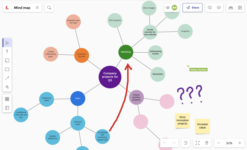 L'utilizzo di un software di mappatura mentale è uno dei modi migliori per mettere le informazioni su una pagina e sviluppare le idee in modo creativo e innovativo. Una mappa mentale è l'ideale per frammentare ampi concetti in idee specifiche e scoprire nuovi modi di pensare. Il nostro creatore di mappe mentali offre un'area da disegno infinita per te e i tuoi collaboratori, consentendoti di lavorare su un numero illimitato di idee contemporaneamente. Inizia con un modello di mappa mentale e utilizza il disegno a mano libera per aggiungere note e collegare concetti.