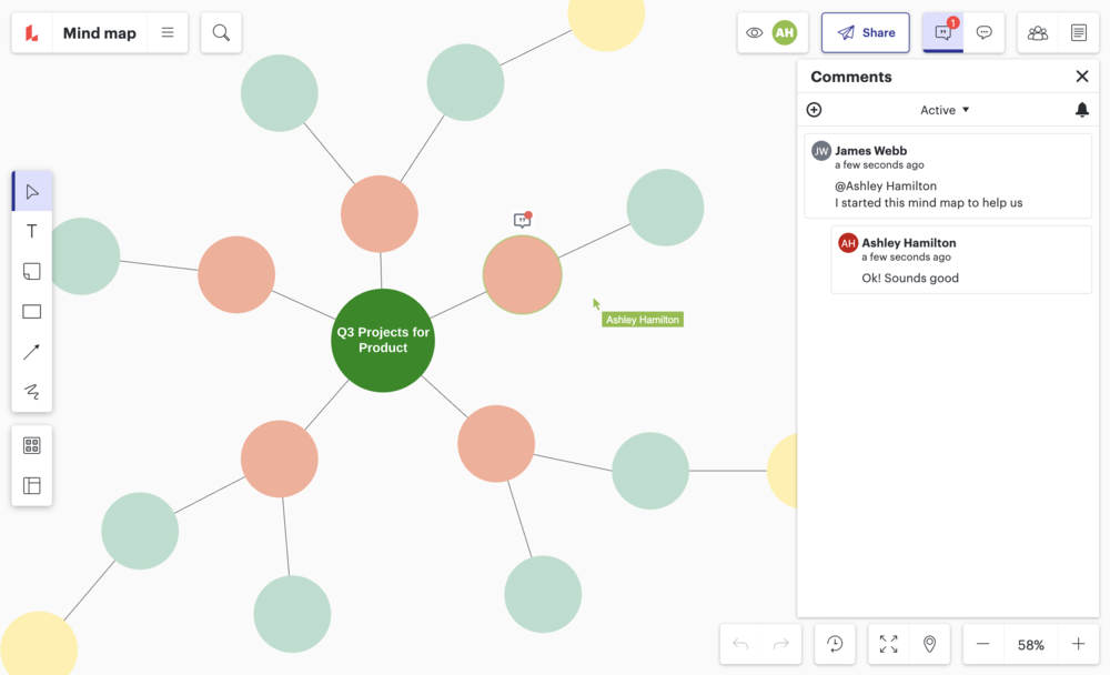 Espanditi e invita i membri del tuo team a contribuire con le loro idee alla tua mappa mentale. Il nostro software per mappe mentali mantiene il tuo team connesso grazie ai commenti, alla funzione @mentions e alla chat integrata nell'editor: tutti questi strumenti sono usati per sollecitare feedback e attirare l'attenzione dove è necessario. Puoi persino focalizzare l'attenzione del tuo gruppo su un'area specifica della tavola e seguire i singoli collaboratori per vedere tutti i loro aggiornamenti in tempo reale.