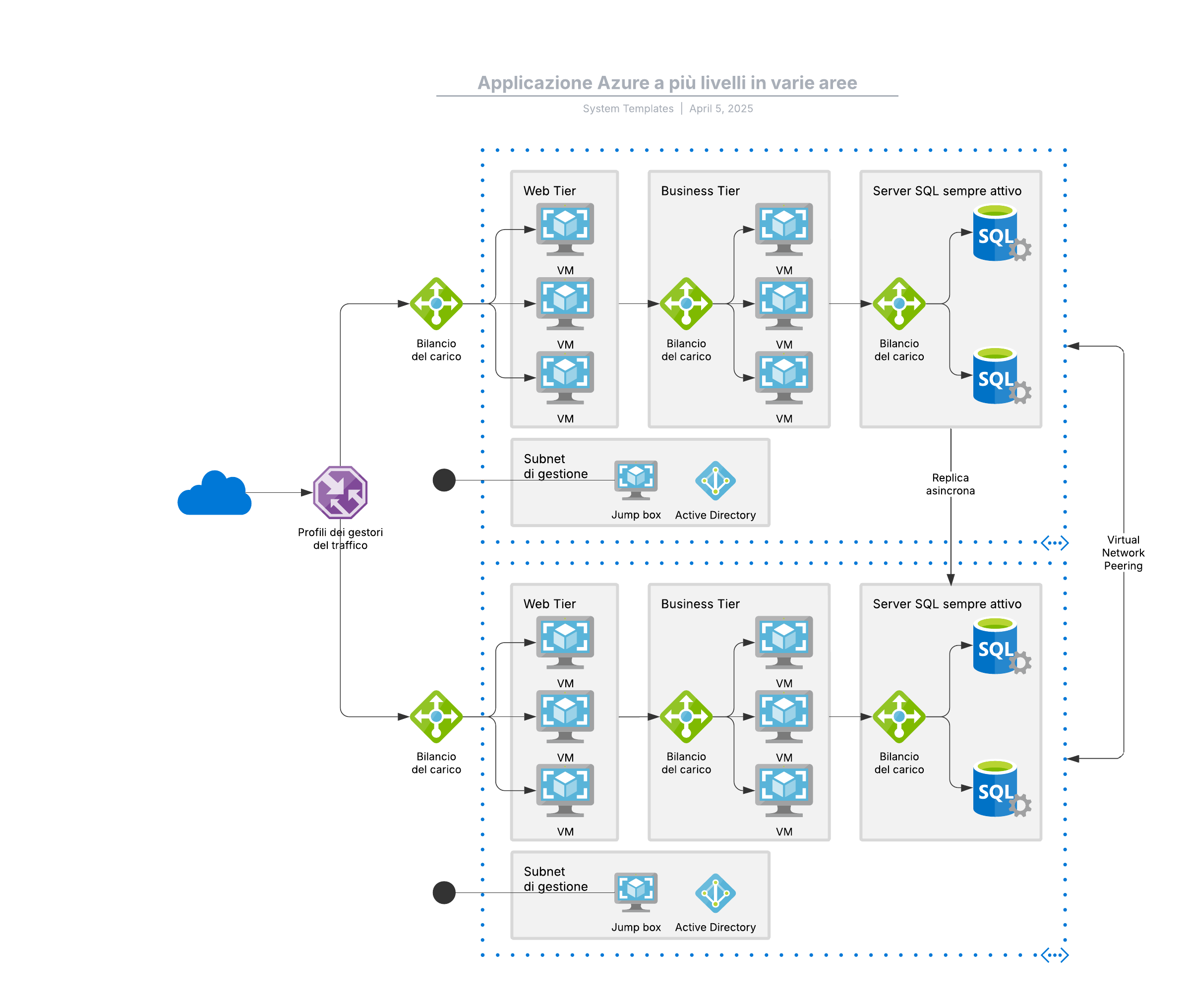 Apri questo modello per visualizzare un architettura di riferimento di un'applicazione Azure a più livelli in varie aree, che puoi personalizzare in base al tuo caso d'uso.