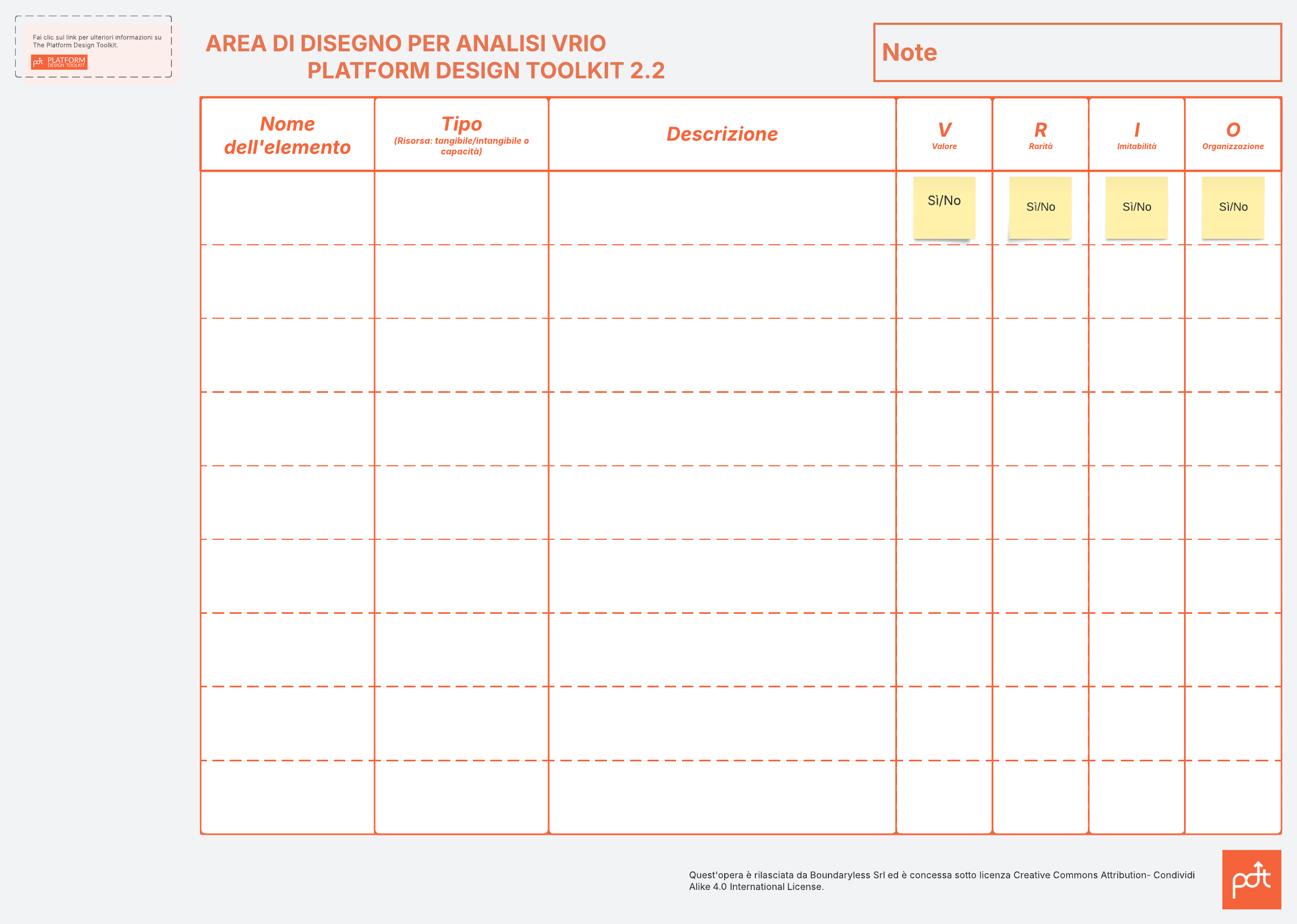 Mappa le risorse/i vantaggi esistenti di un'organizzazione utilizzando l'analisi VRIO: valore, rarità, imitabilità e organizzazione.
