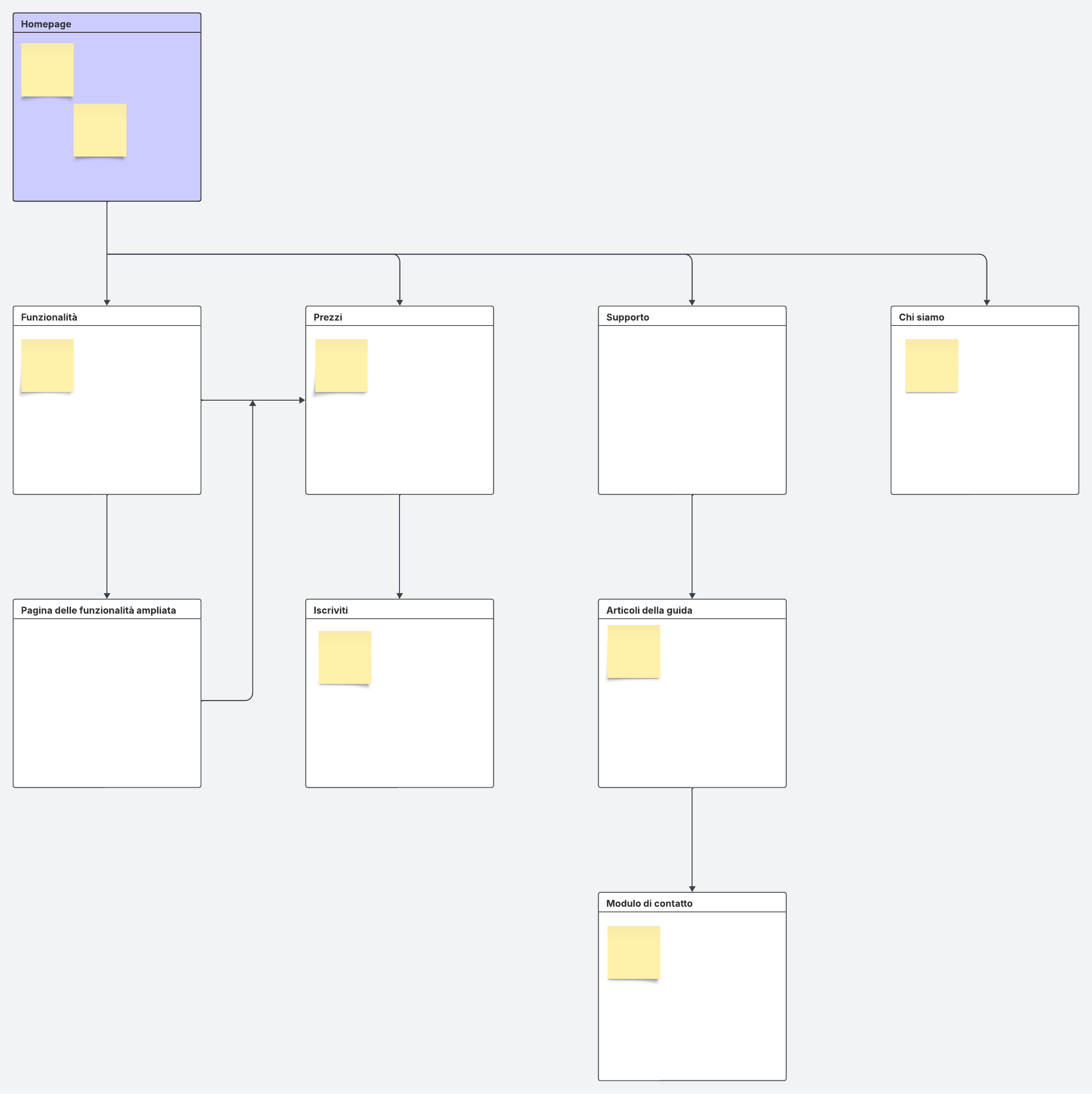 Usa questo diagramma di flusso per sito web per mappare l'interfaccia utente del tuo sito web e visualizzare come i visitatori navigheranno nel tuo sito.