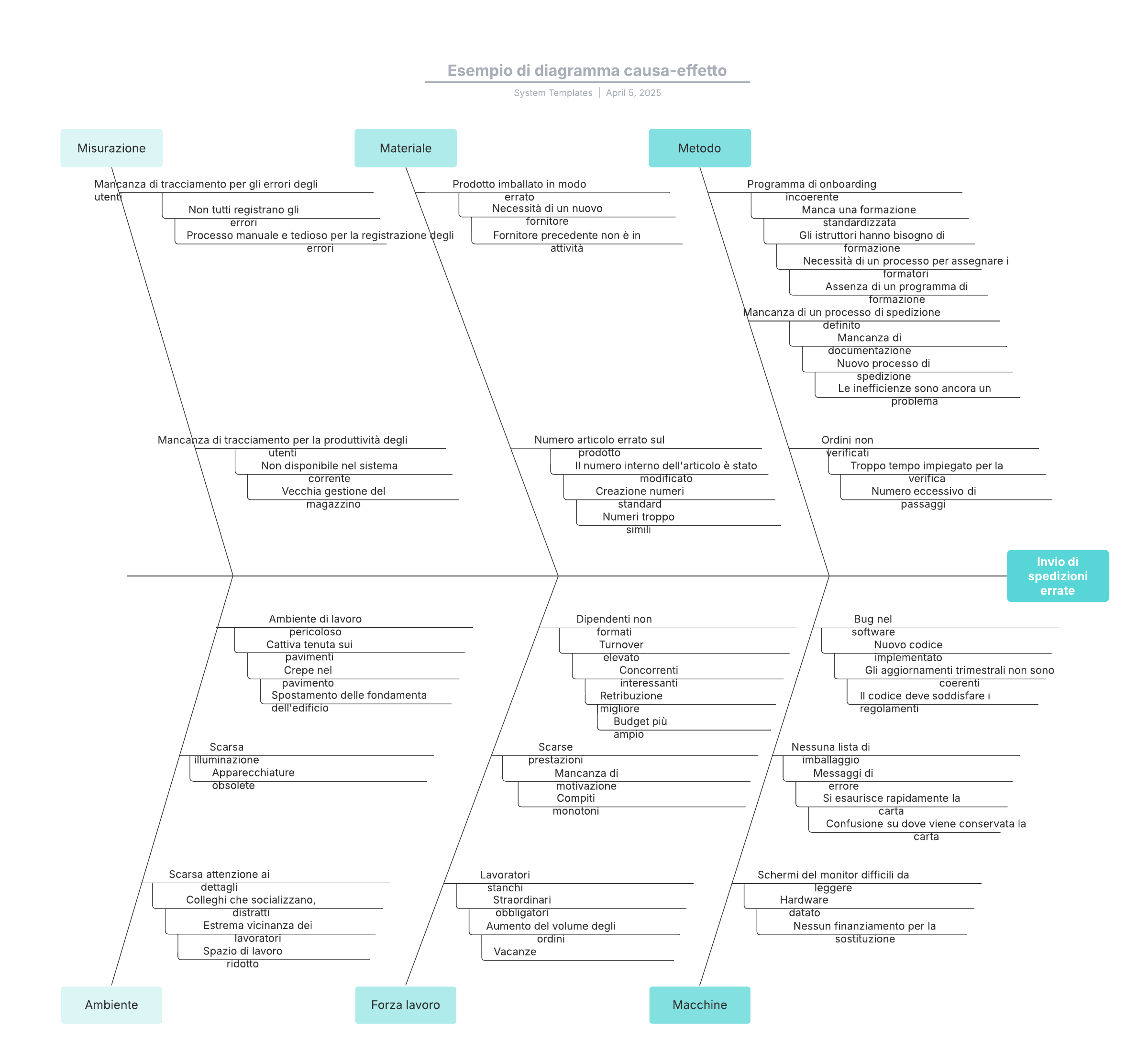 Apri questo modello per visualizzare l'esempio dettagliato di un diagramma causa-effetto, che puoi personalizzare in base al tuo caso d'uso.