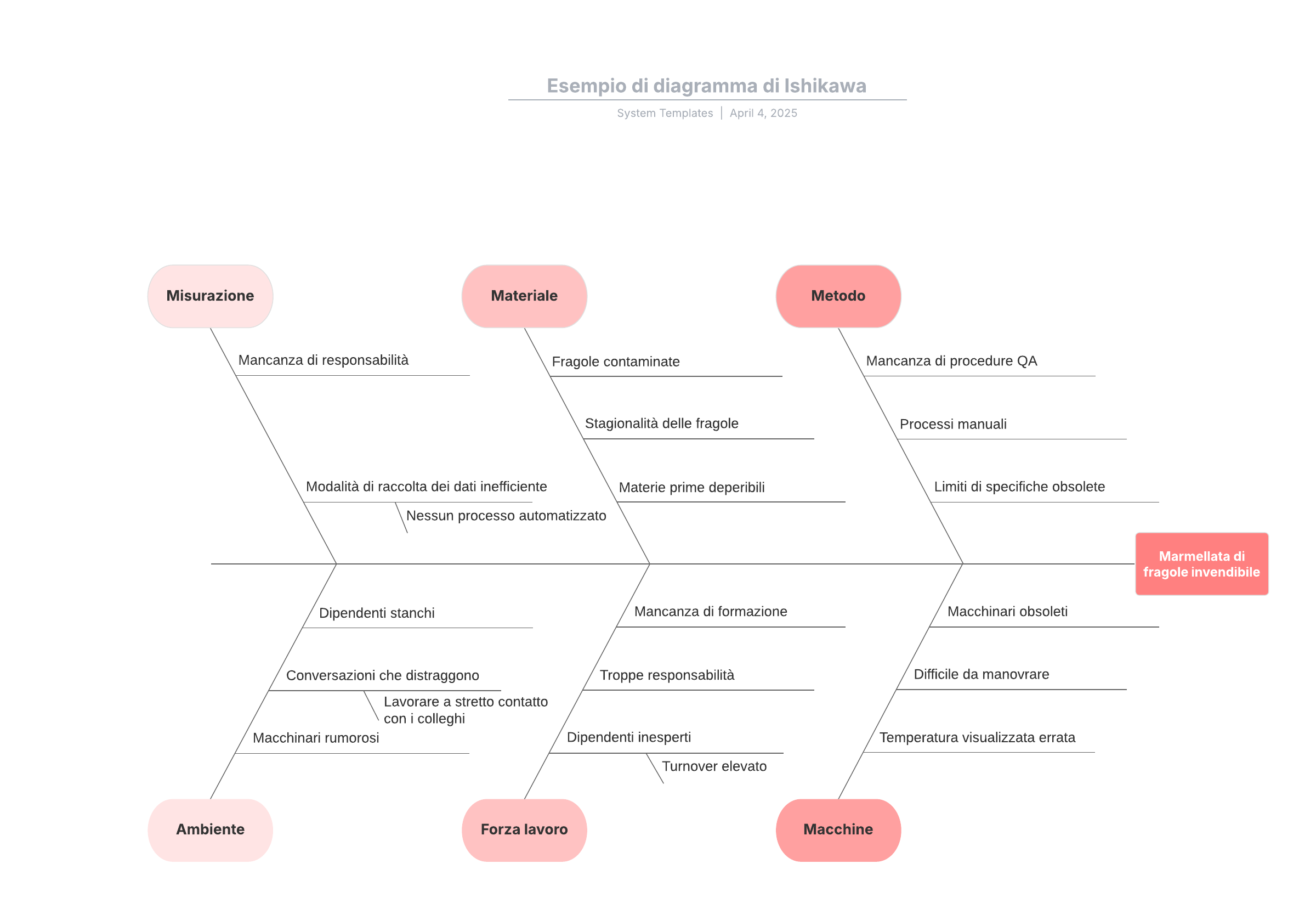 Apri questo modello per visualizzare un esempio dettagliato di un diagramma di Ishikawa, che puoi personalizzare in base al tuo caso d'uso.
