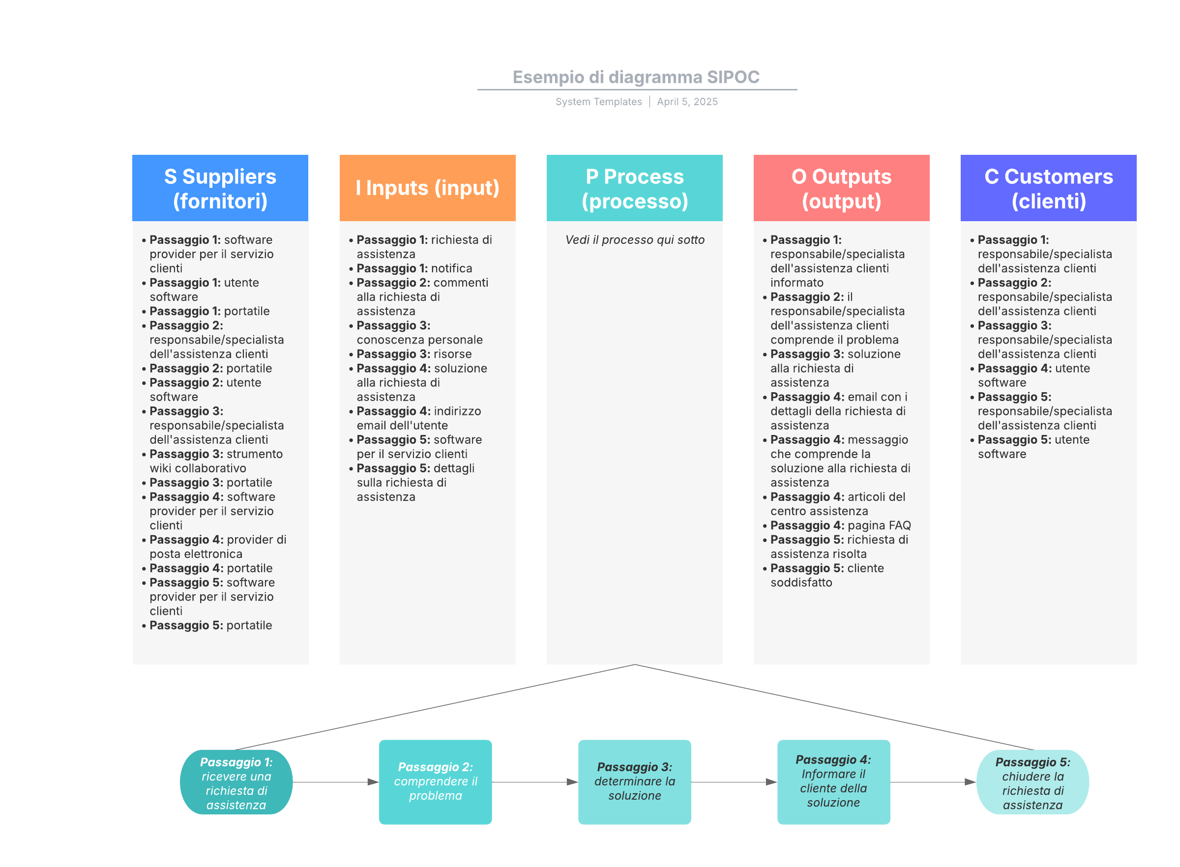 Apri questo modello per visualizzare l'esempio dettagliato di un diagramma SIPOC di base, che puoi personalizzare in base al tuo caso d'uso.