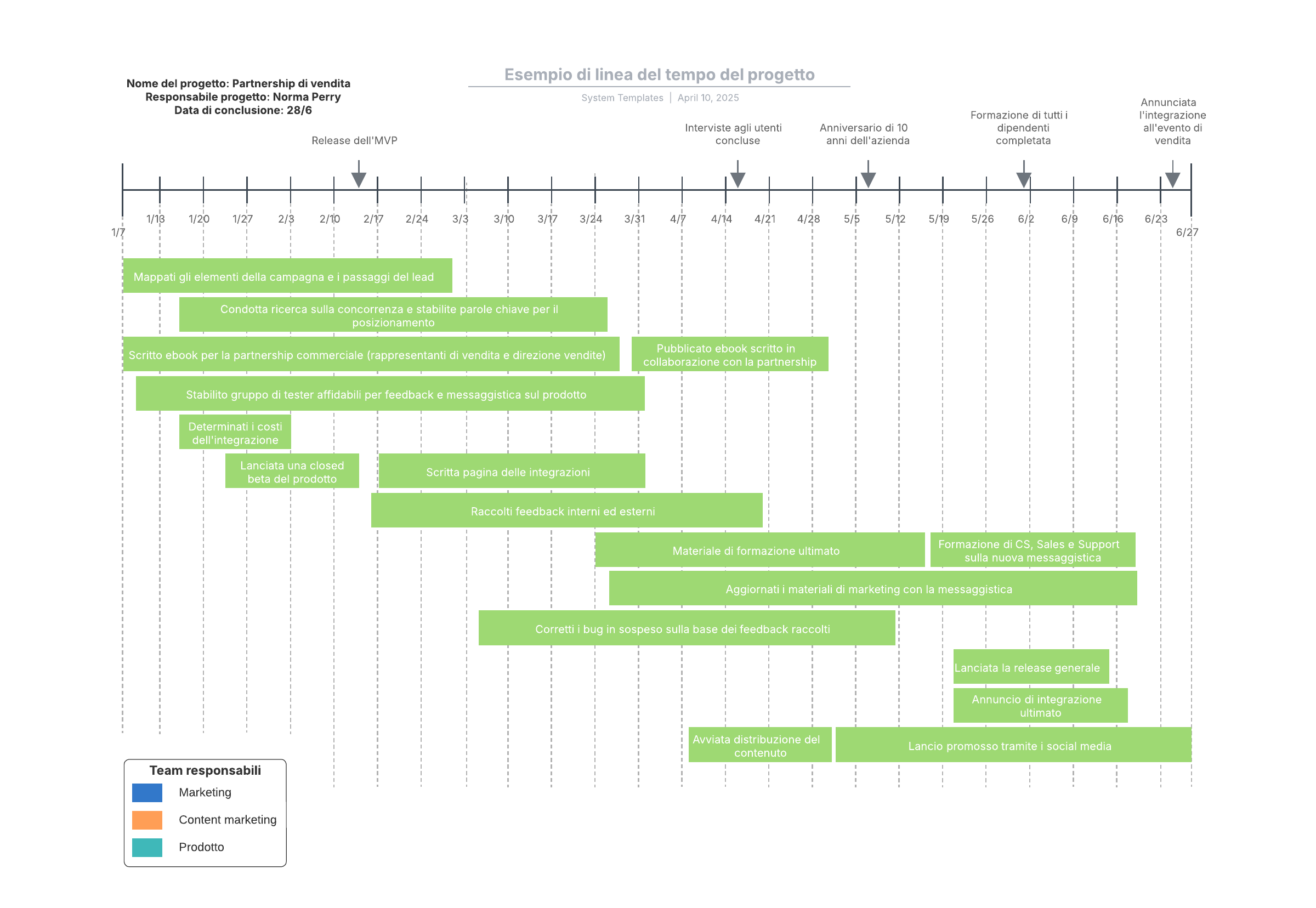 Apri questo modello per visualizzare un esempio dettagliato di una linea del tempo di progetto, che puoi personalizzare in base al tuo caso d'uso.