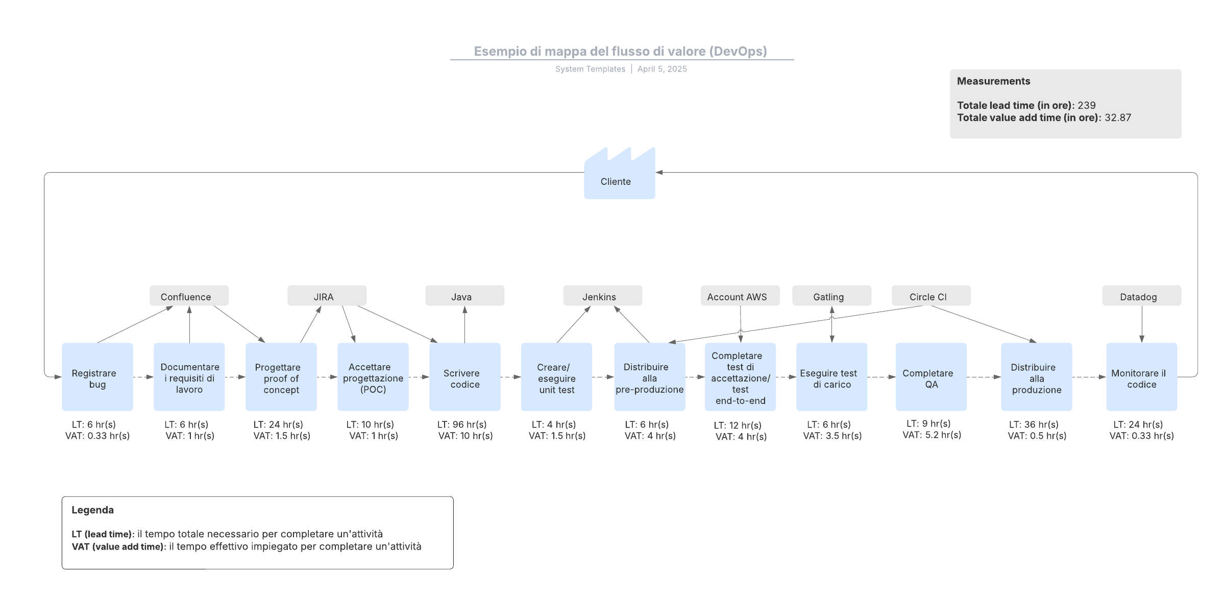 Apri questo modello per visualizzare l'esempio dettagliato di una mappa del flusso di valore (DevOps), che puoi personalizzare in base al tuo caso d'uso.