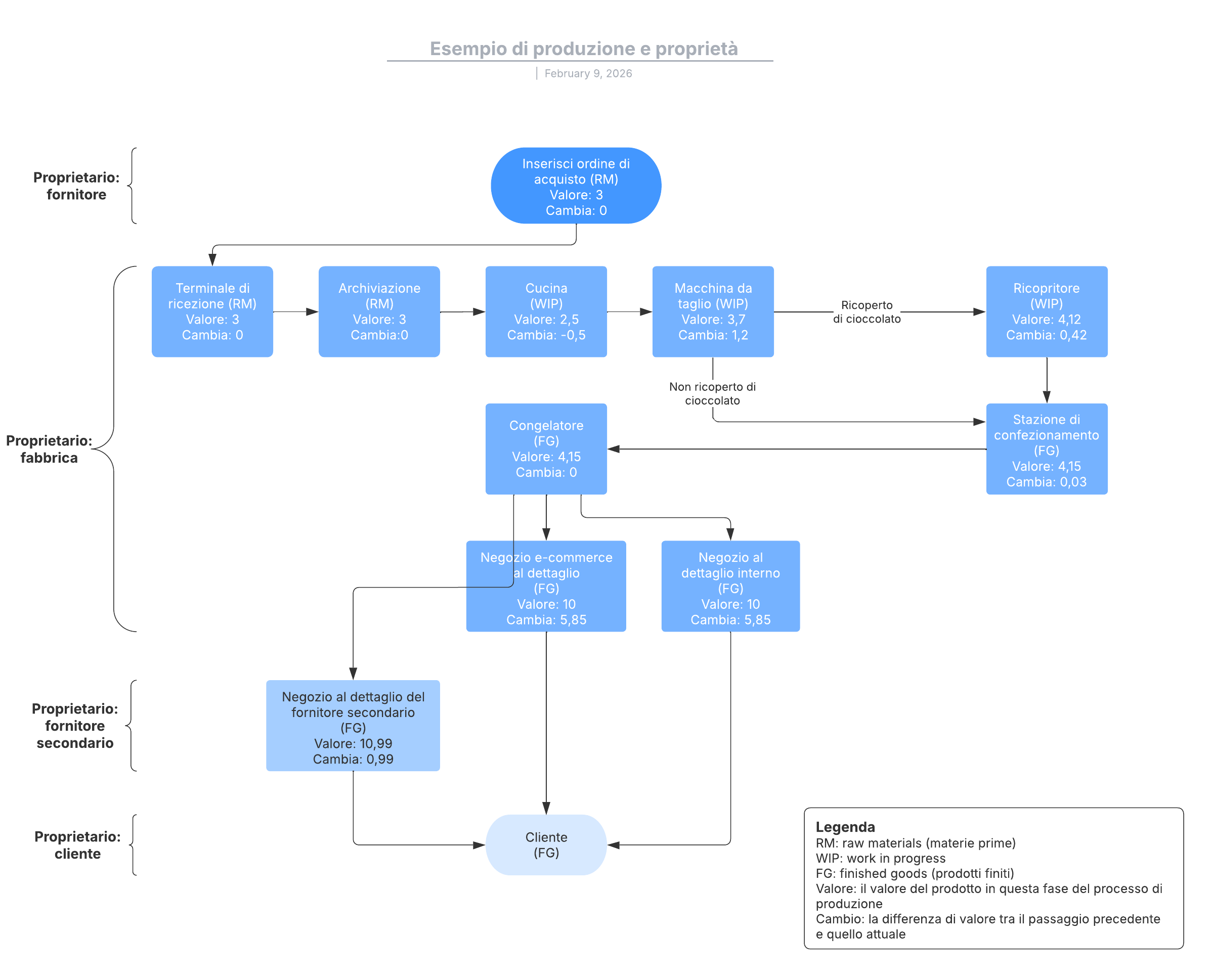Apri questo modello per visualizzare un esempio dettagliato di un diagramma di flusso di produzione e proprietà, che puoi personalizzare in base al tuo caso d'uso.