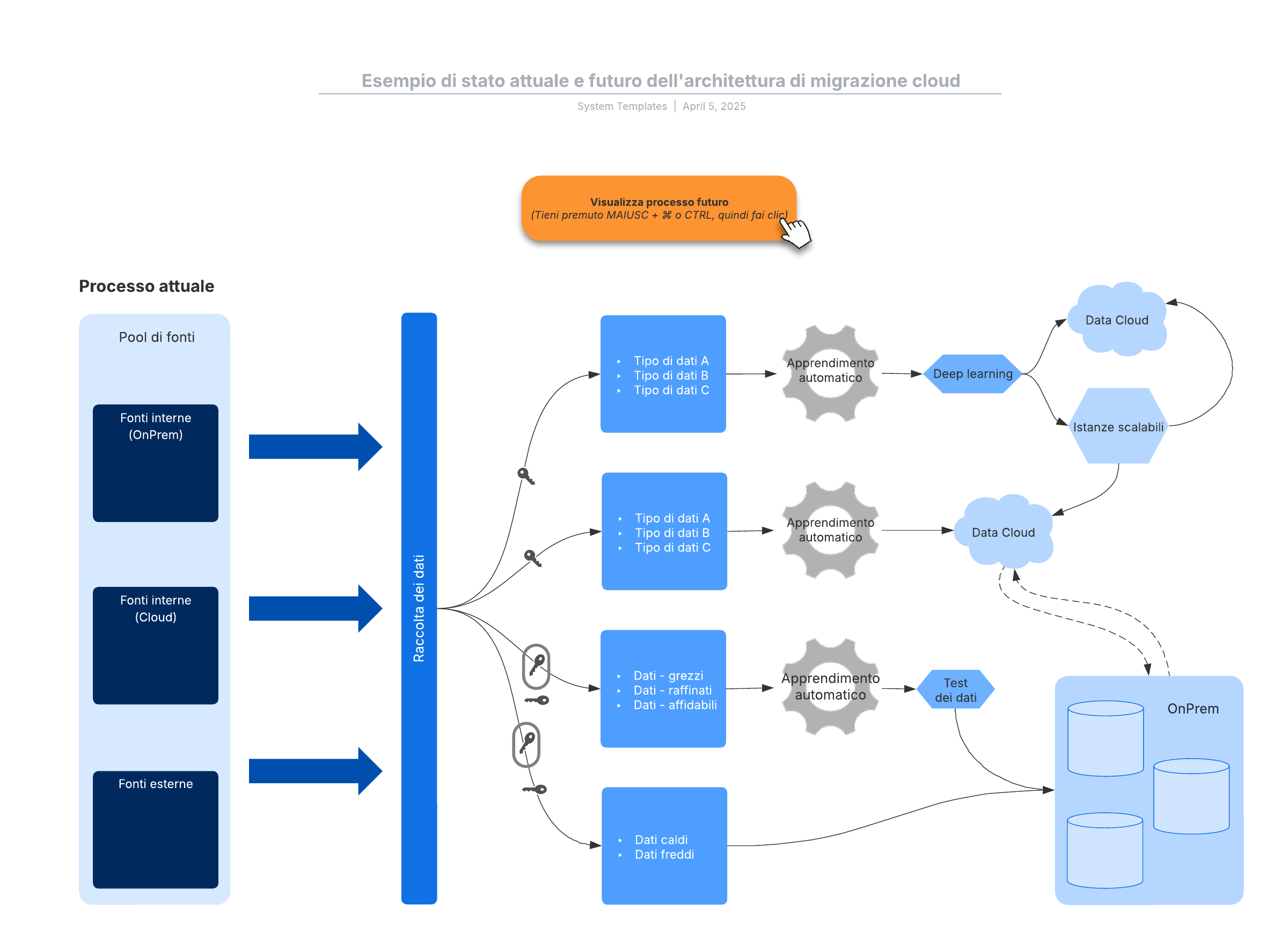 Questo modello di diagramma di stato attuale/futuro dell'architettura di migrazione nel cloud può aiutarti a: