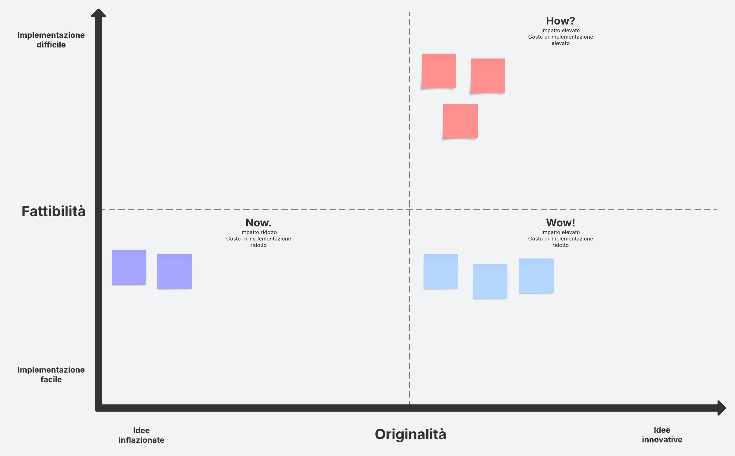 Usa questa matrice How, Now, Wow per valutare le idee in base alla fattibilità e all'originalità. Posiziona le tue idee sulla matrice per individuare quelle innovative e che possono essere implementate rapidamente.