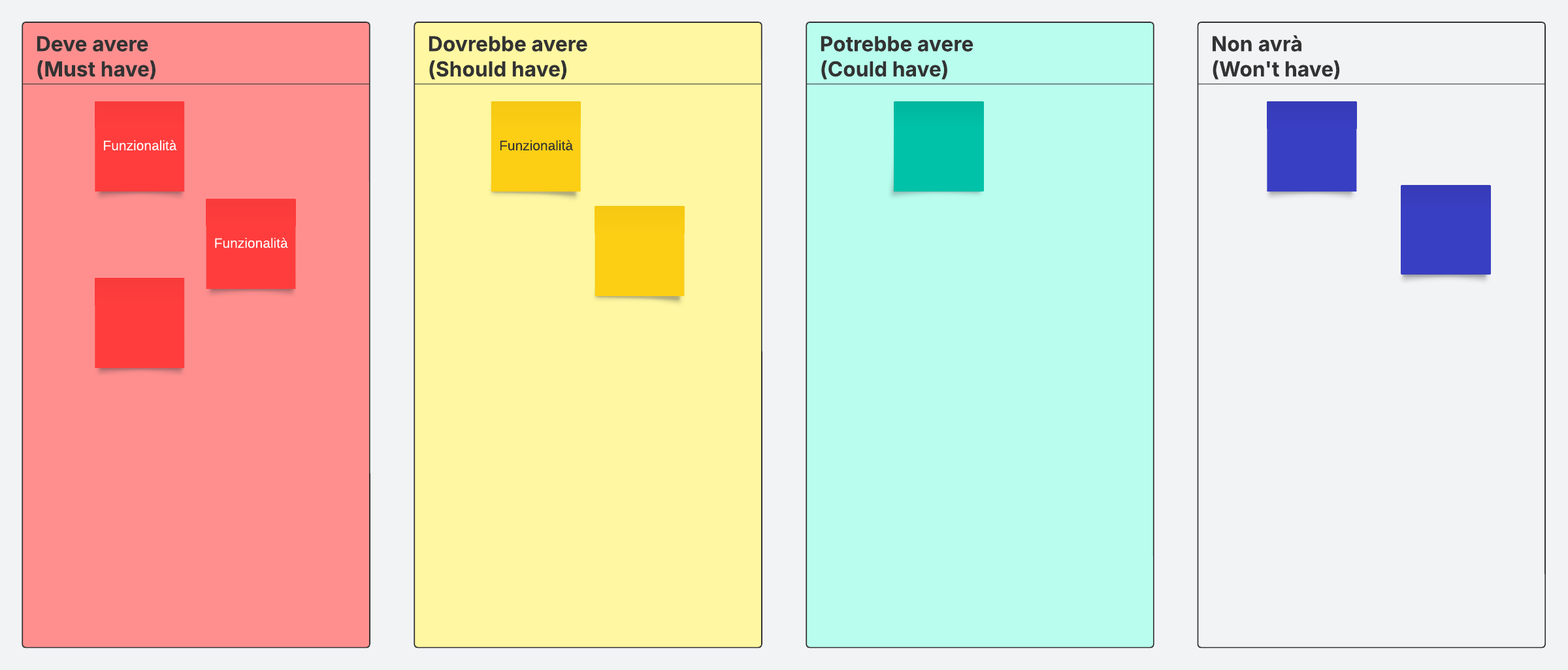 Prova il metodo MoSCoW per assegnare priorità a iniziative e caratteristiche in modo strategico. Suddividi le iniziative nelle quattro categorie: Must Have (Deve avere), Should Have (Dovrebbe avere), Could Have (Potrebbe avere) o Won't Have (Non avrà). Una volta riconosciute le caratteristiche più preziose, potrai implementarle per prime. MoSCoW è un acronimo inglese che significa Must have, Should have, Could have e Won't have.