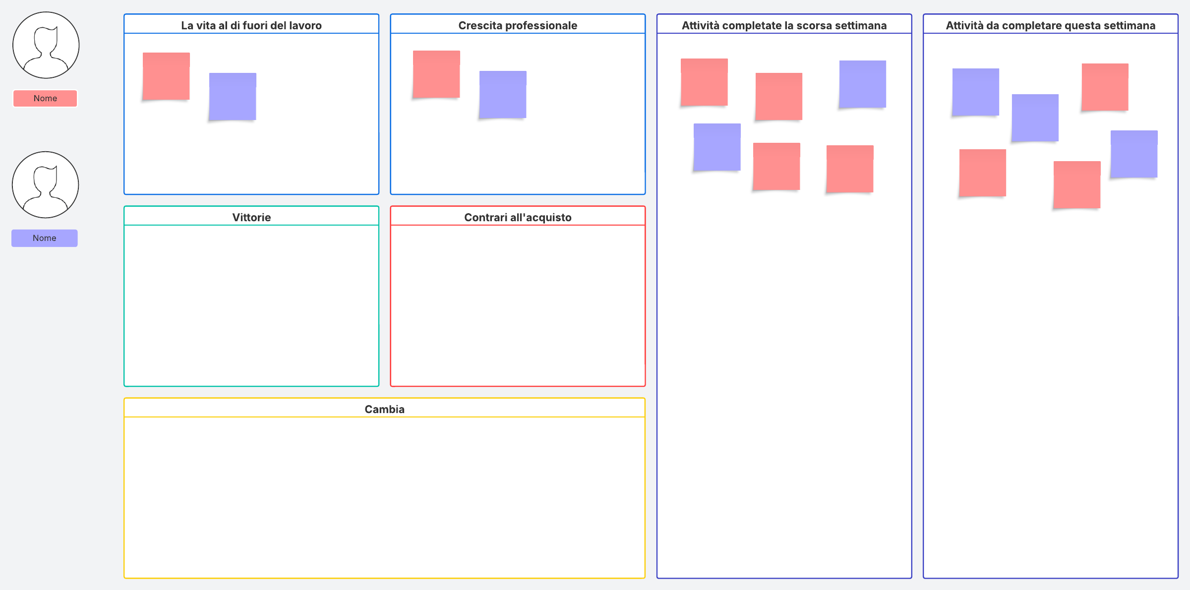 Rendi gli incontri 1:1 ancora più efficaci seguendo un ordine del giorno. Questo modello di incontro 1:1 facilita la discussione sulla vita al di fuori del lavoro, la crescita professionale, le vittorie, gli ostacoli e il feedback. Tieni traccia dei risultati della scorsa settimana e delle prossime attività.