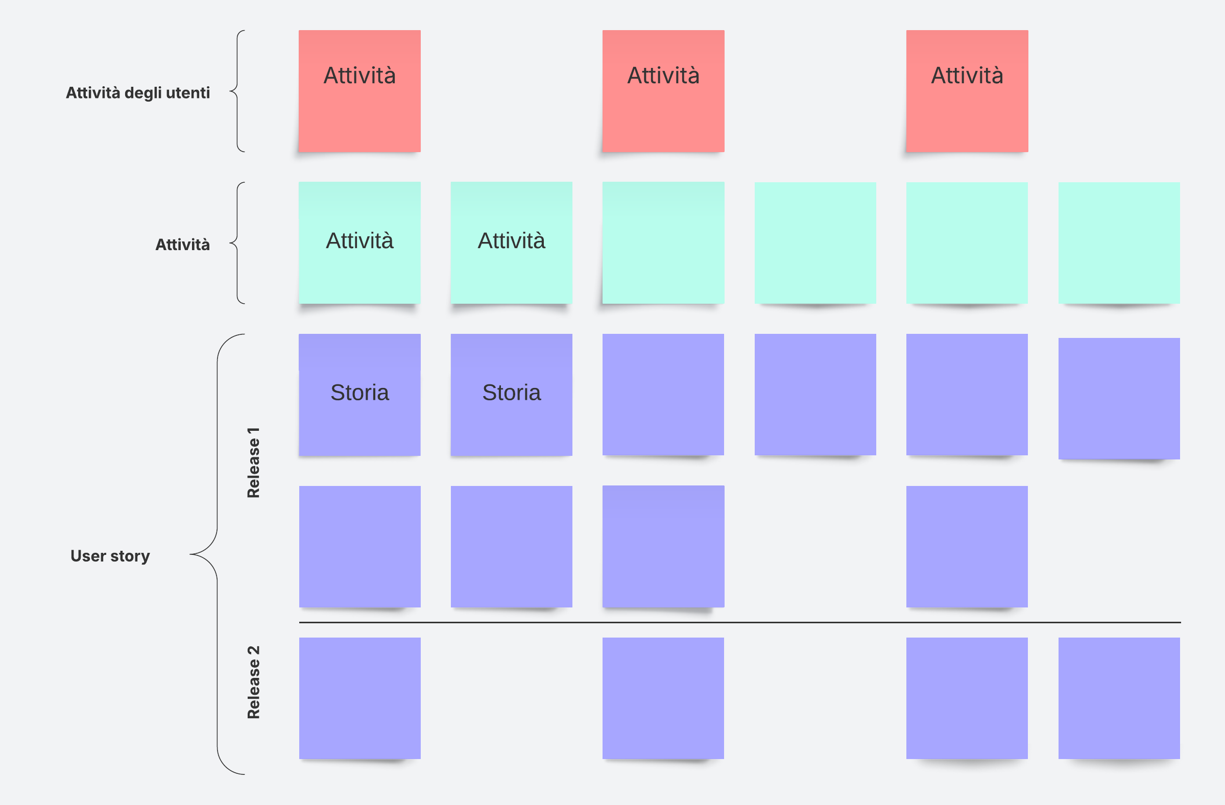 Puoi utilizzare i post-it per espandere facilmente il modello e includere ulteriori informazioni e storie degli utenti. Dopo aver raggruppato le storie degli utenti in base ai passaggi e alle attività, puoi anche suddividerle facilmente in base all'iterazione del prodotto per vedere eventuali differenze nell'esperienza dell'utente.