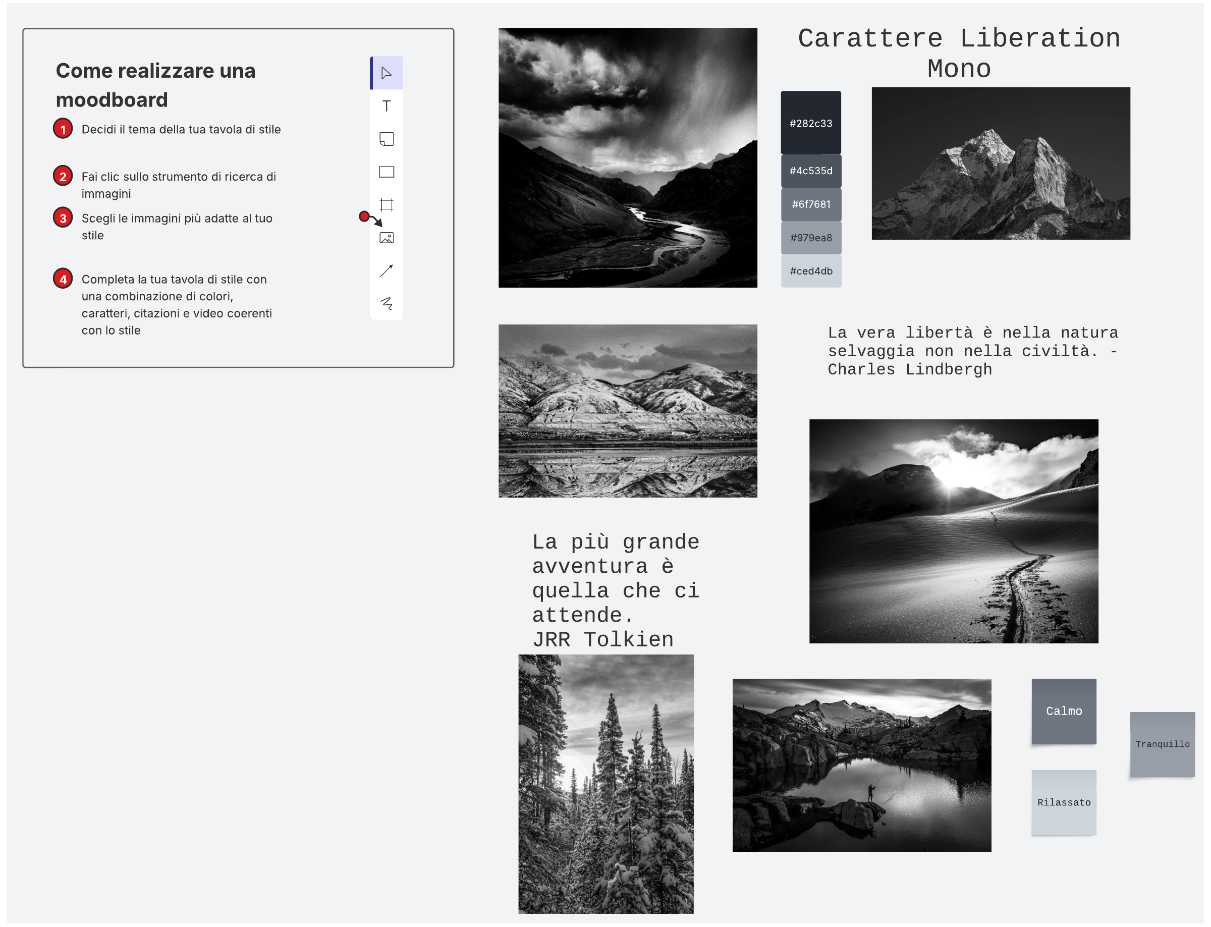 Fai brainstorming e scopri l'atmosfera del tuo prossimo grande progetto con questa moodboard.
