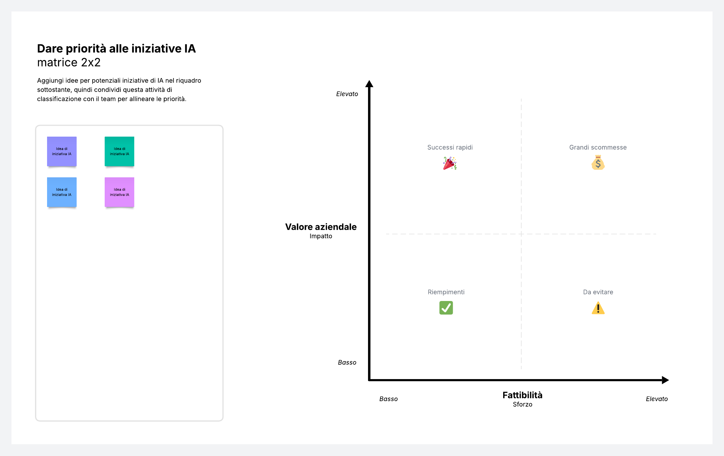 Classifica le idee per le iniziative IA su una matrice 2x2 rispetto al valore aziendale e alla fattibilità.