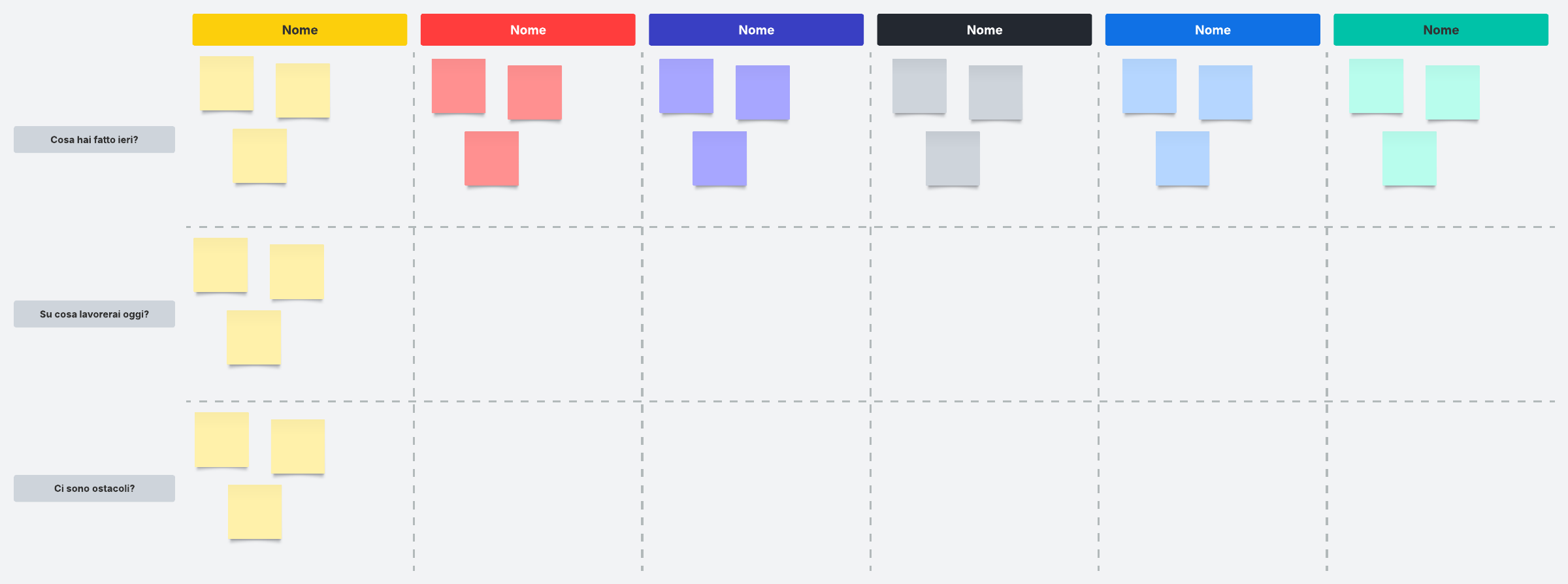 Usa questa bacheca delle riunioni in piedi giornaliere per mantenere il team sulla stessa pagina. Le riunioni in piedi aiutano i membri del team a sapere a cosa si sta lavorando e offrono l'opportunità di affrontare eventuali ostacoli.